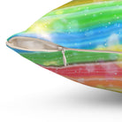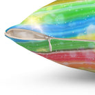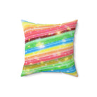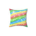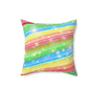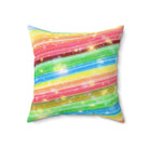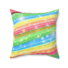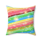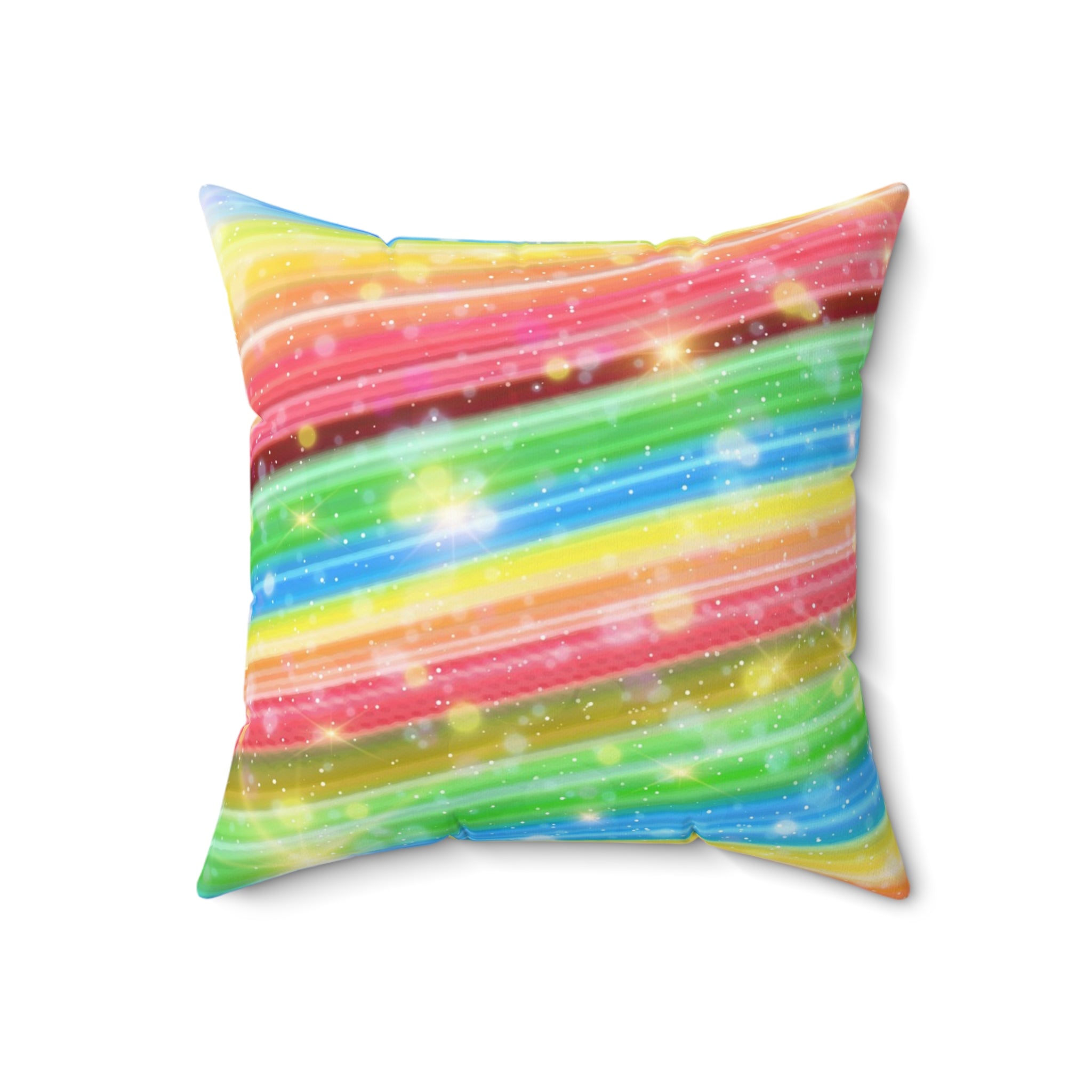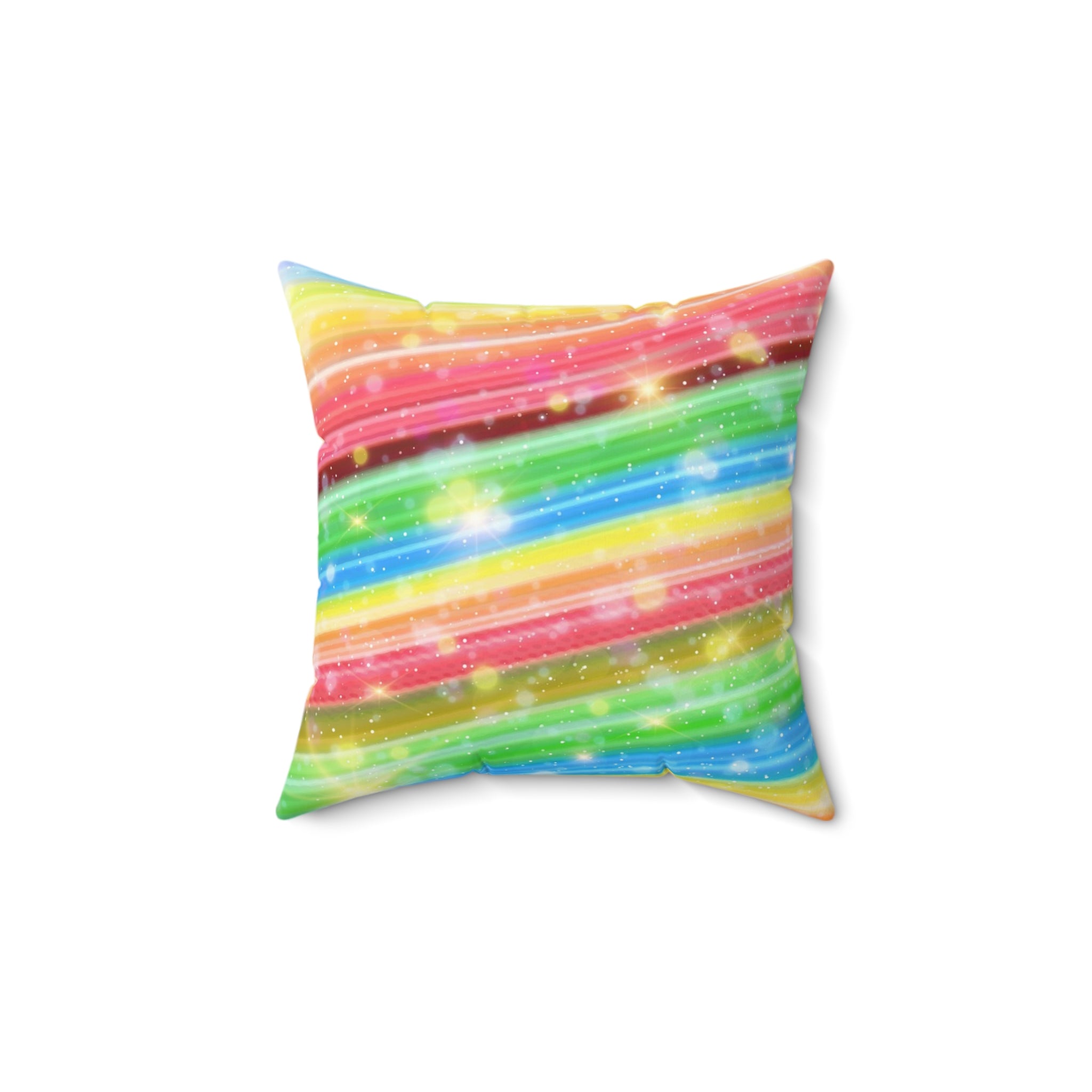A colorful and sparkly rainbow candy stripe design adorns this spun polyester square pillow, adding a playful and vibrant touch to any living space. Perfect for those who love bright and cheerful decor, this pillow is ideal for adding a pop of color to your home during birthday celebrations, pride month, or any festive occasion.