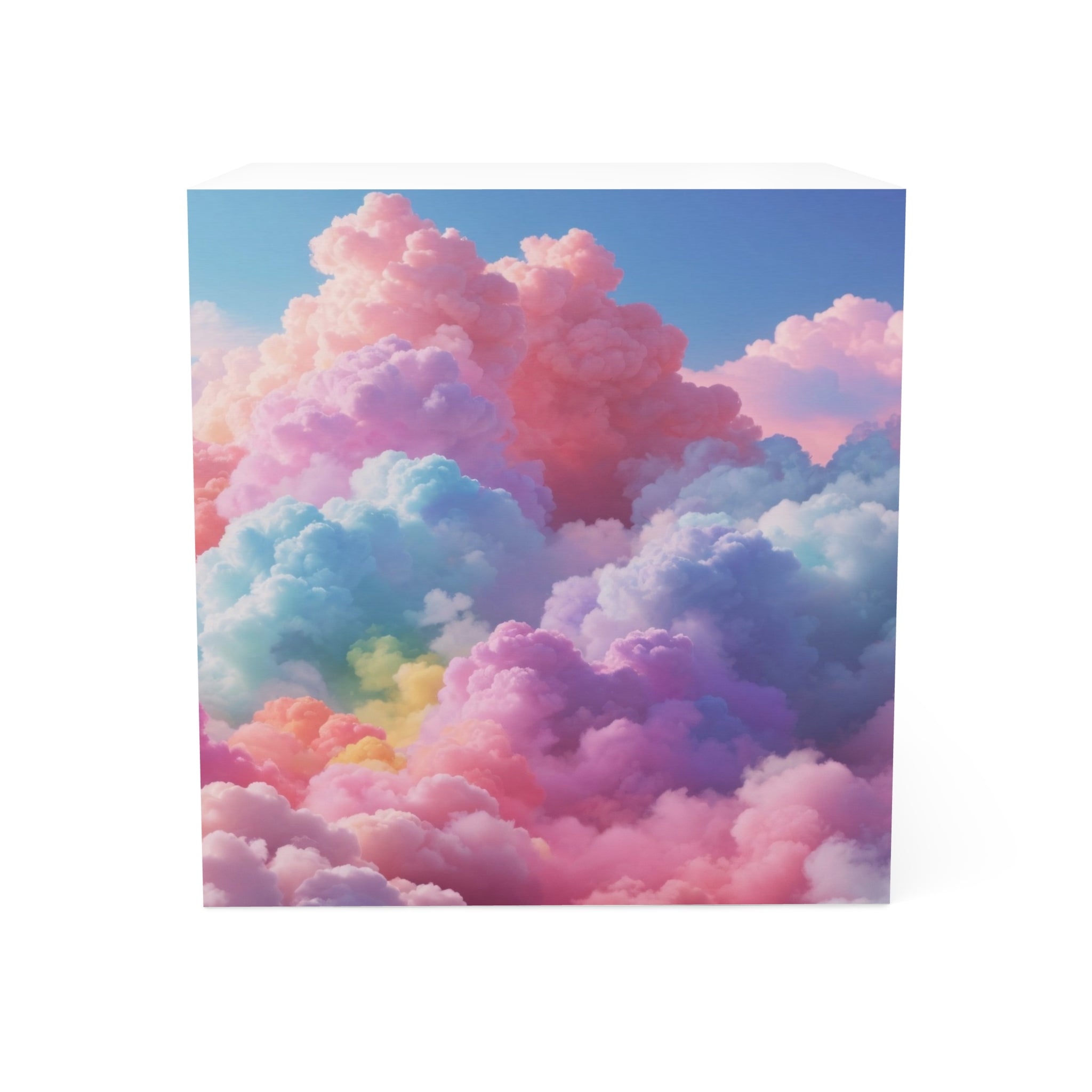 A whimsical Note Cube featuring pastel rainbow clouds design, perfect for adding a touch of color and cheer to your workspace. Ideal for those who love cute and colorful stationery items and want to stay organized in style. Relevant for back-to-school, office workers, and stationery enthusiasts.