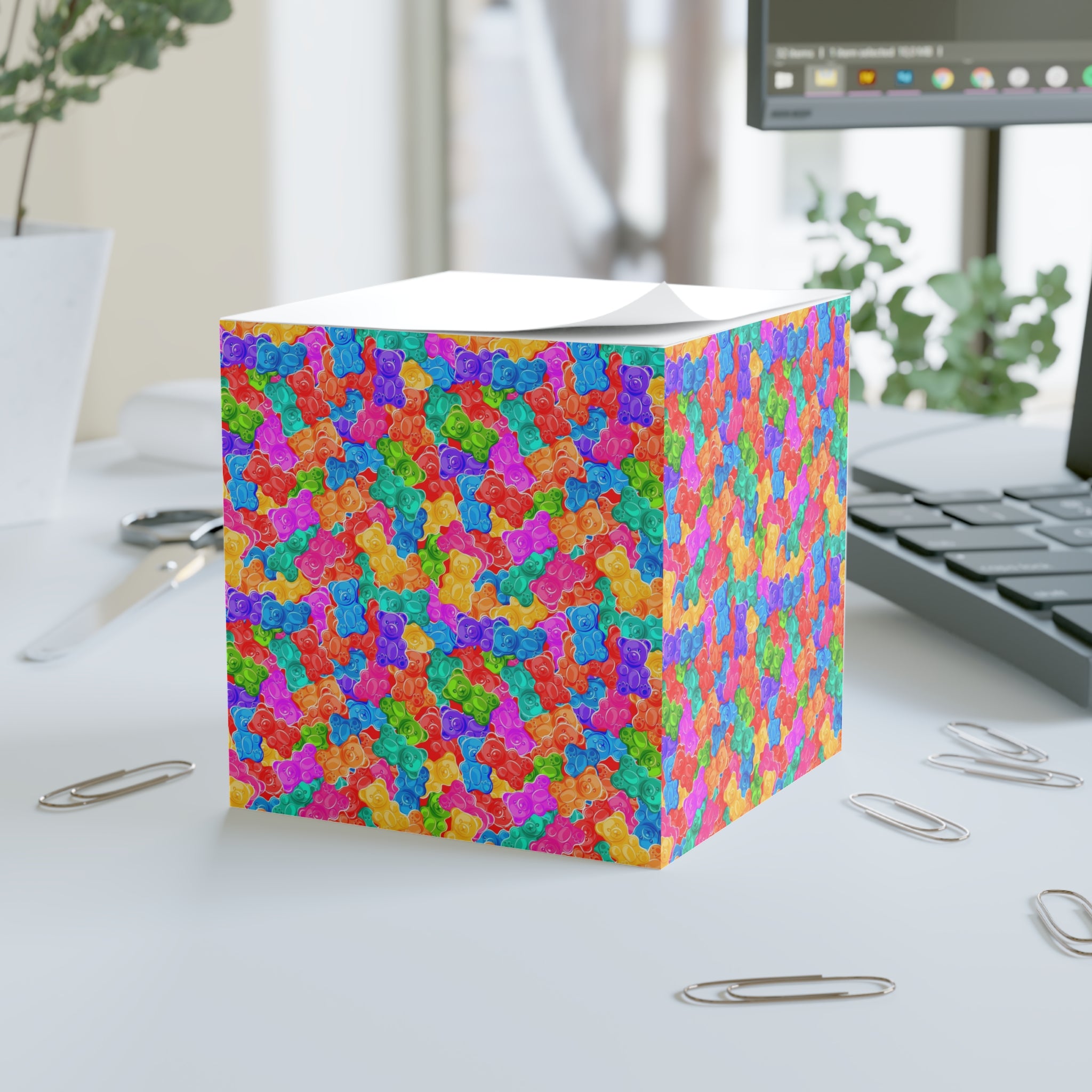 Indulge in the sweetness of colorful rainbow gummy bears with this vibrant note cube. Perfect for adding a playful touch to your workspace and staying organized in style. Ideal for students, teachers, and anyone who loves fun stationery. Great for birthdays, back-to-school season, and office celebrations.