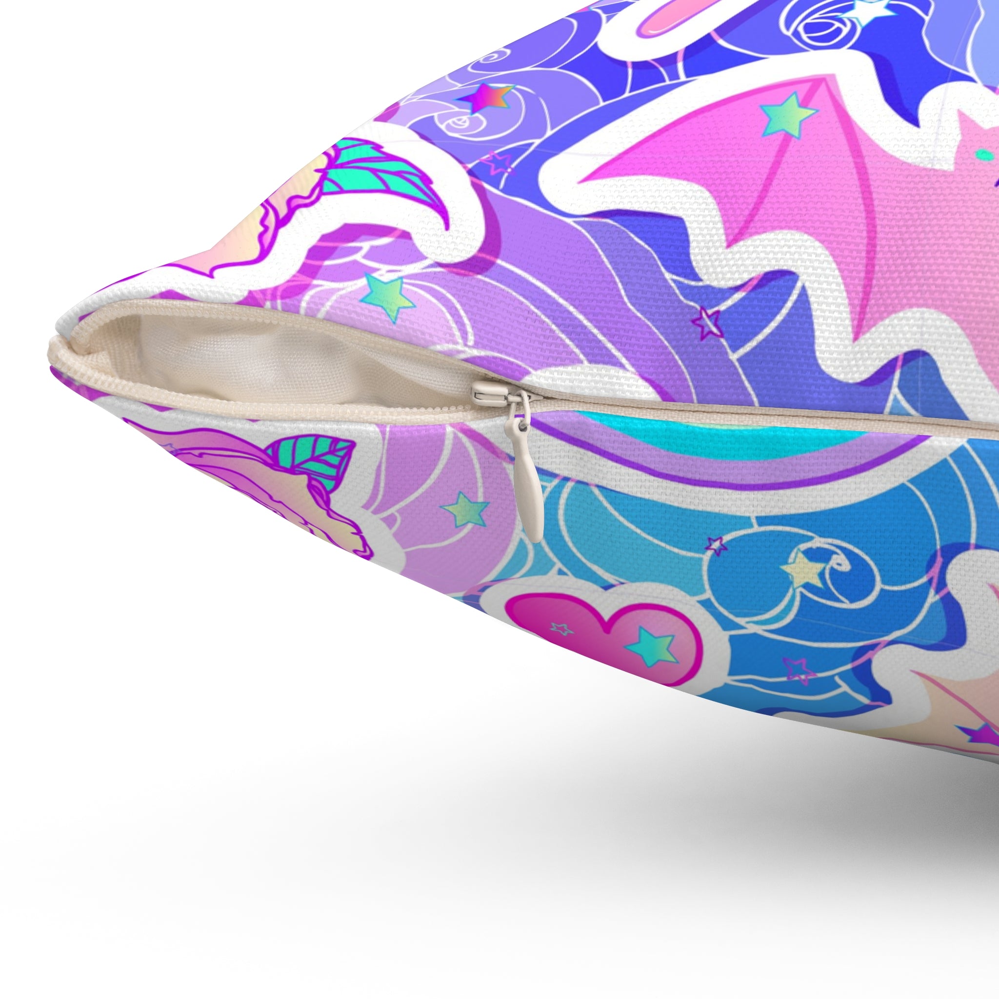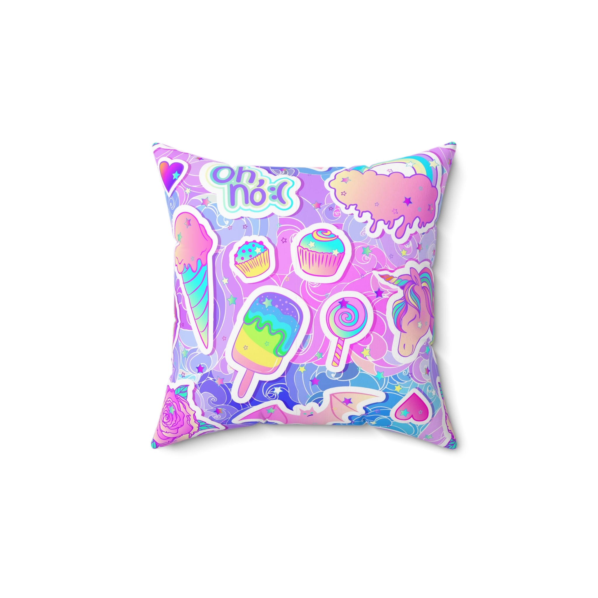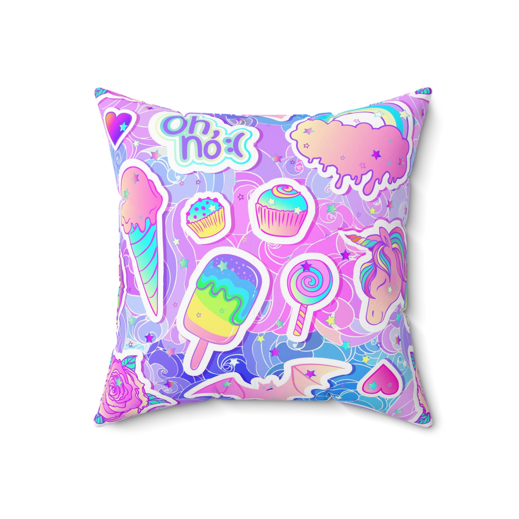 A whimsical square pillow featuring unicorns, ice cream, roses, bats, popsicles, and rainbows. This fun and colorful pillow is perfect for adding a playful touch to any living space or bedroom. Ideal for unicorn lovers, fantasy enthusiasts, and anyone who enjoys cheerful and unique decor. Perfect for birthdays, sleepovers, and children's rooms.