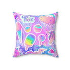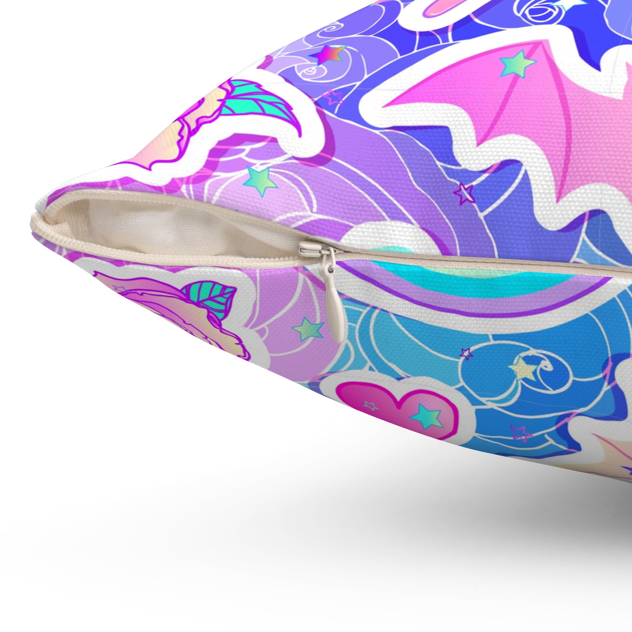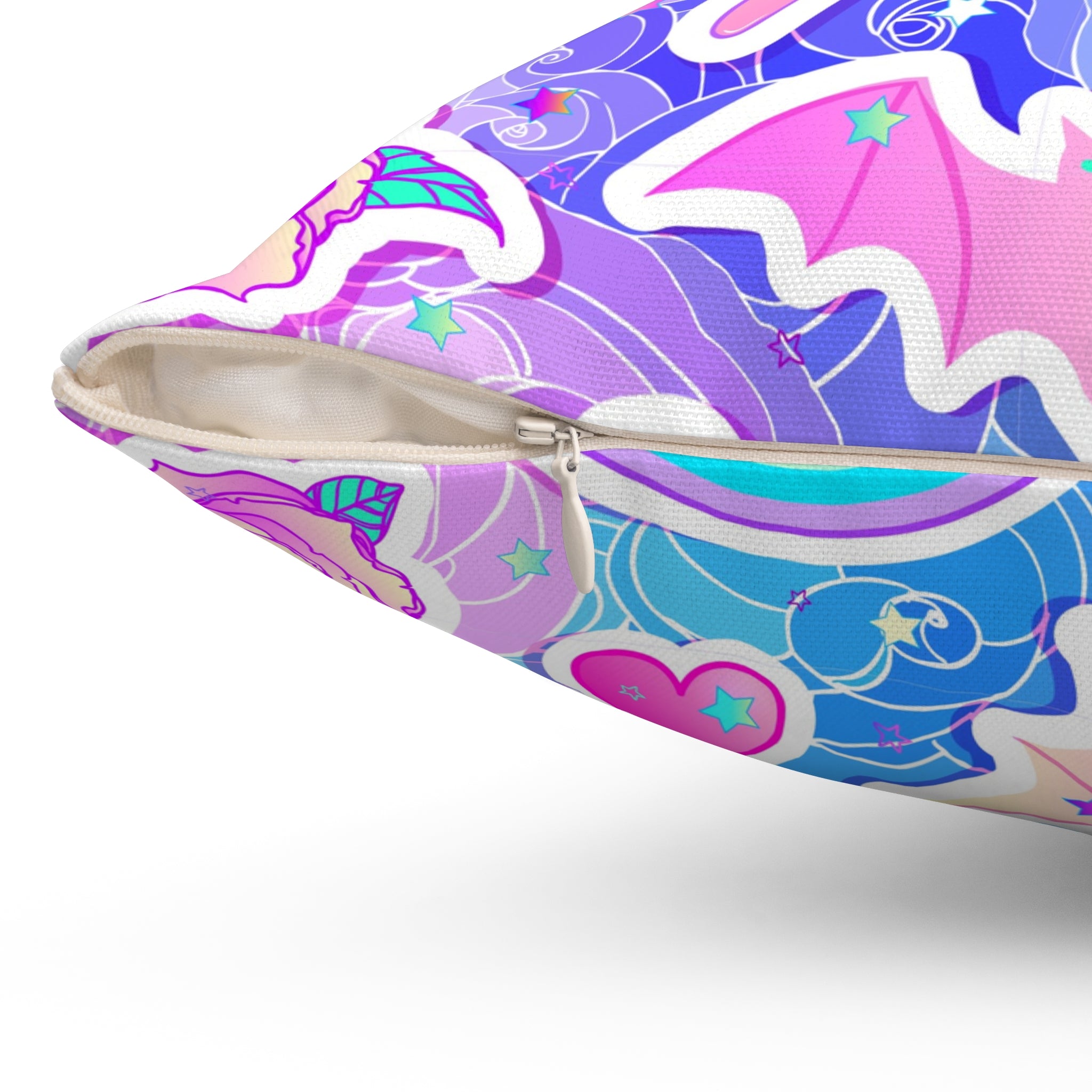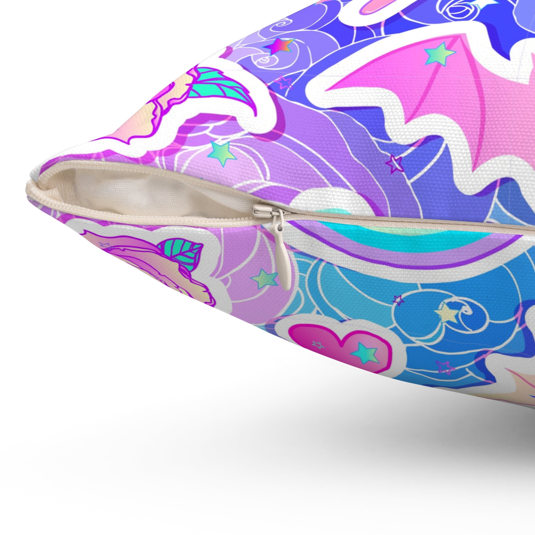 A whimsical square pillow featuring unicorns, ice cream, roses, bats, popsicles, and rainbows. This fun and colorful pillow is perfect for adding a playful touch to any living space or bedroom. Ideal for unicorn lovers, fantasy enthusiasts, and anyone who enjoys cheerful and unique decor. Perfect for birthdays, sleepovers, and children's rooms.