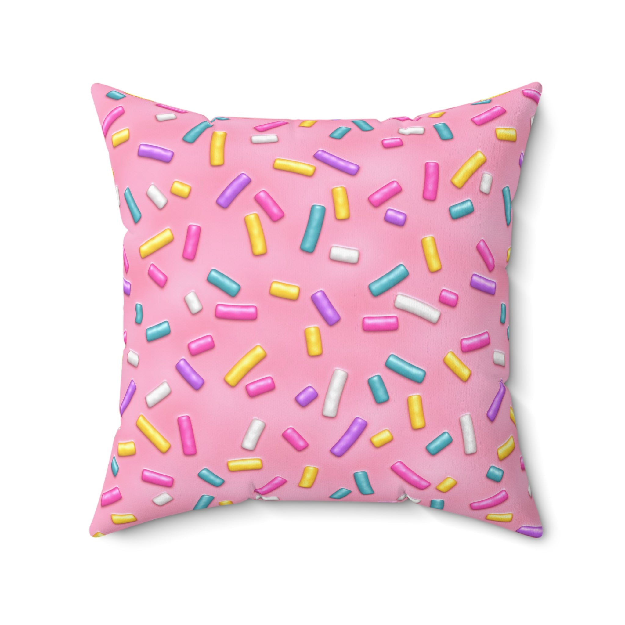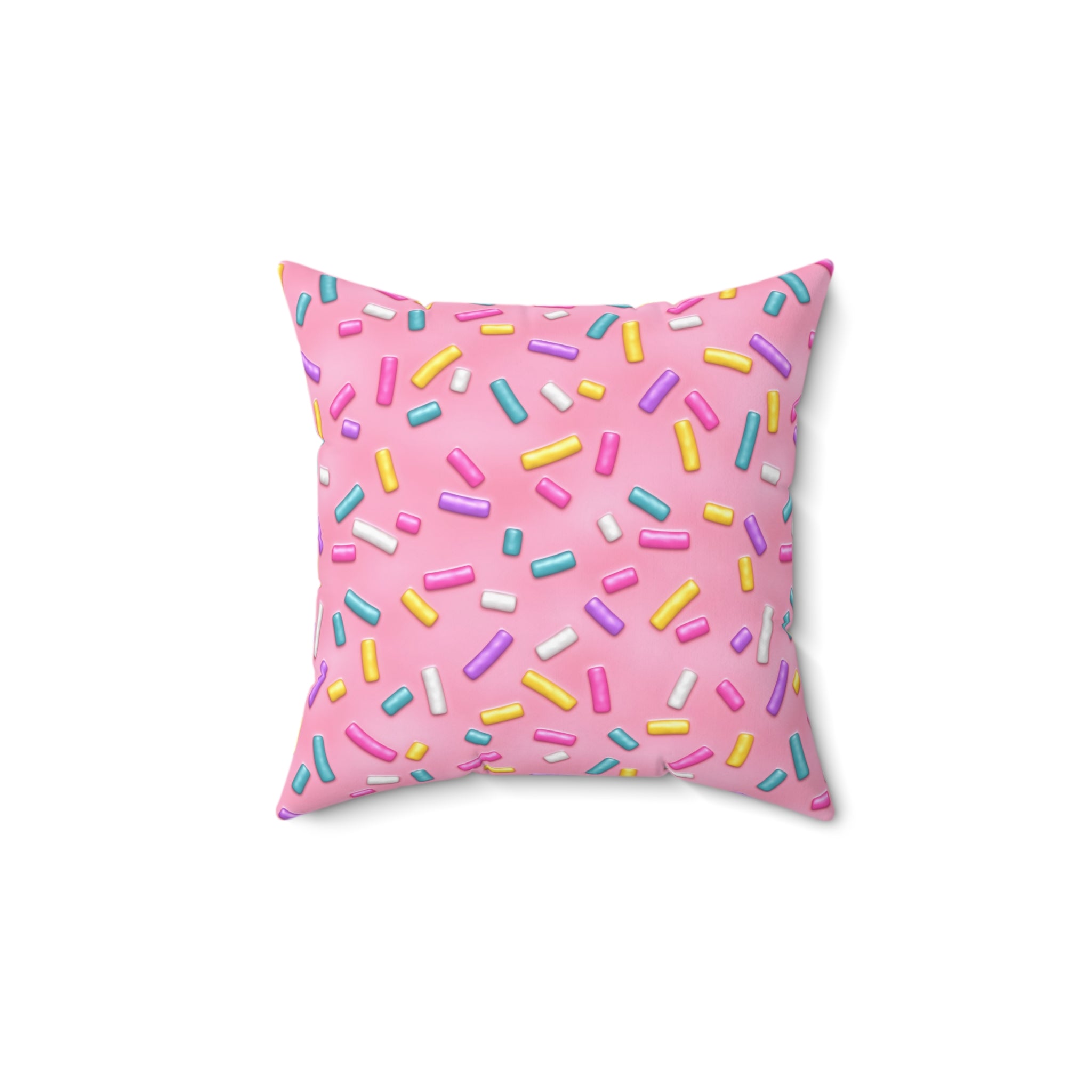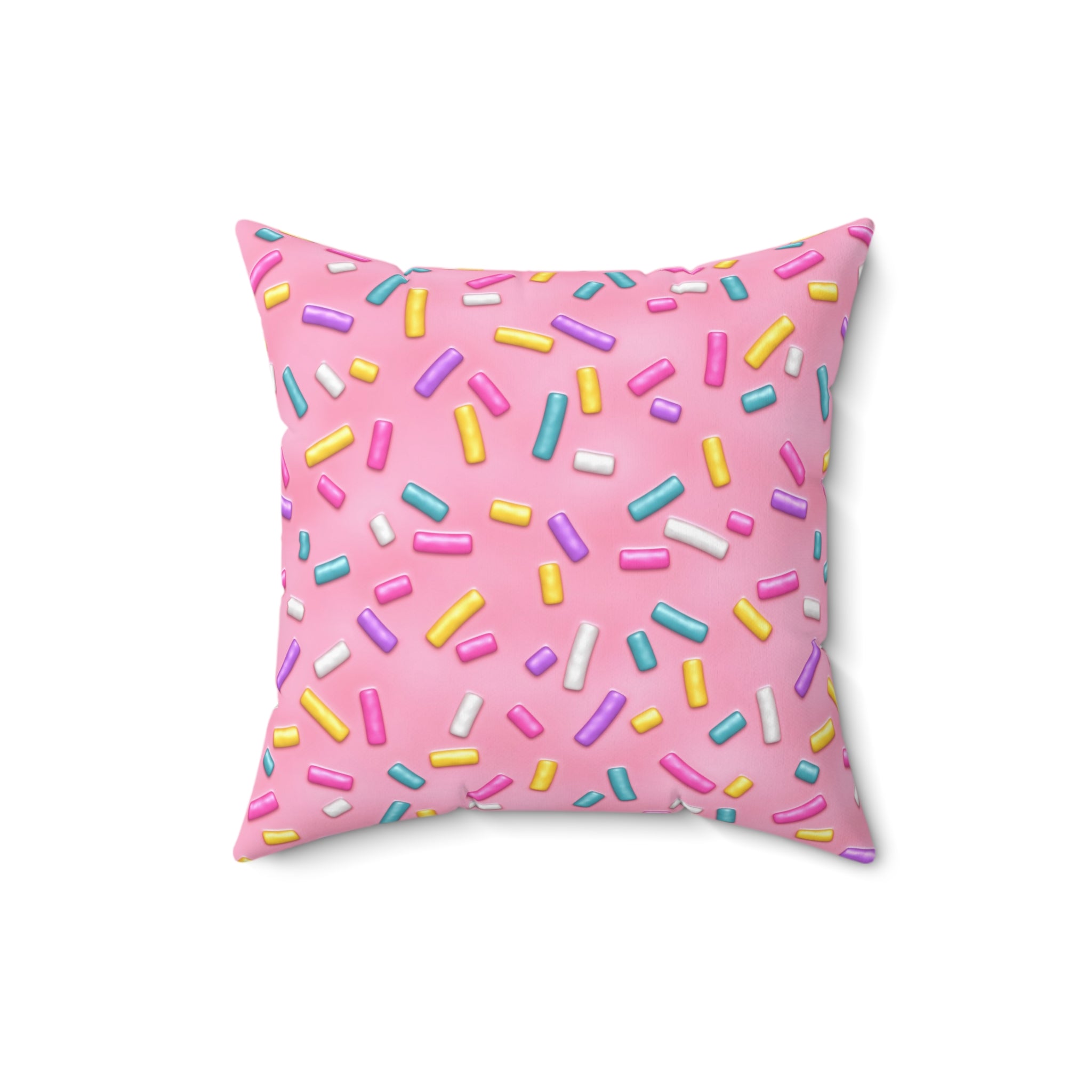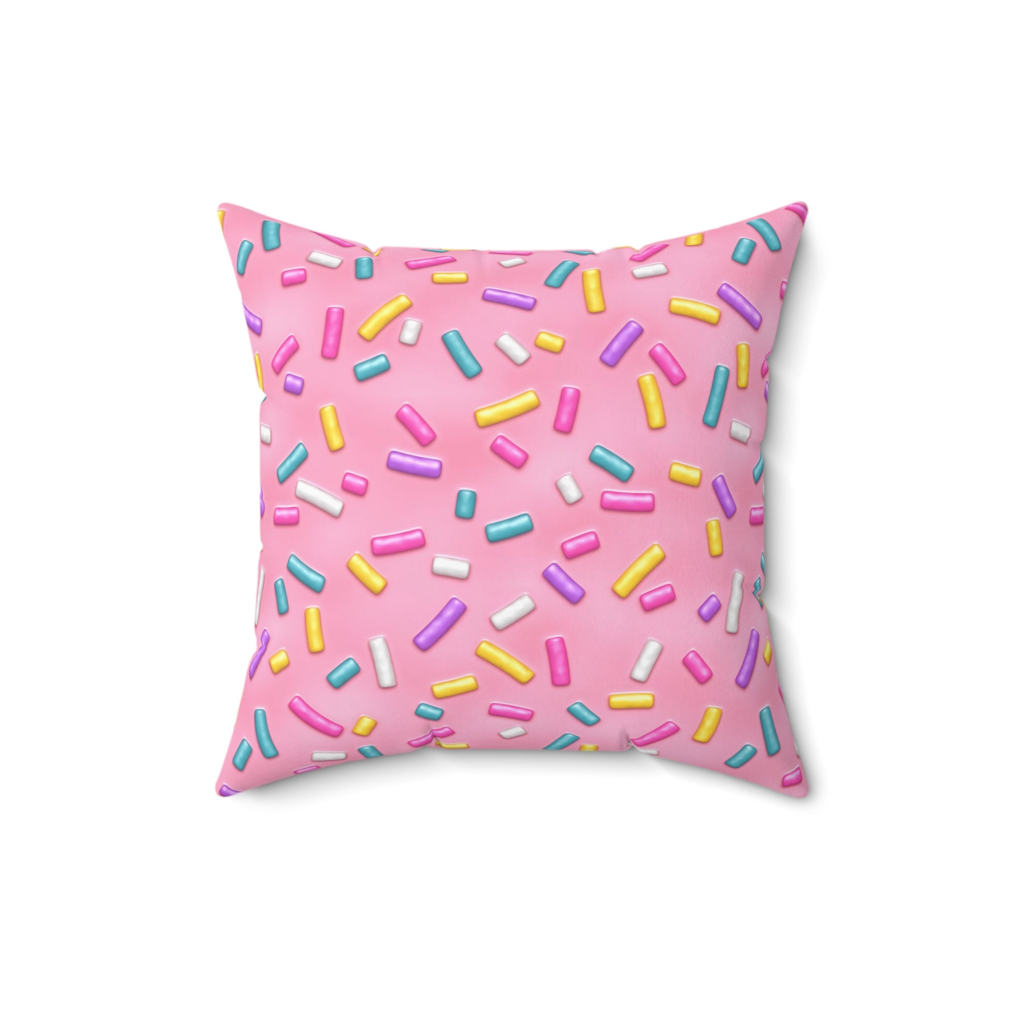 A cozy square pillow with a pink frosting and rainbow sprinkles design, giving a playful and fun vibe to any room. Perfect for those who love whimsical and colorful decor, this pillow is ideal for adding a touch of joy to a living room or bedroom. Great for birthdays, celebrations, or just adding a pop of color to your space.