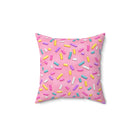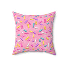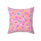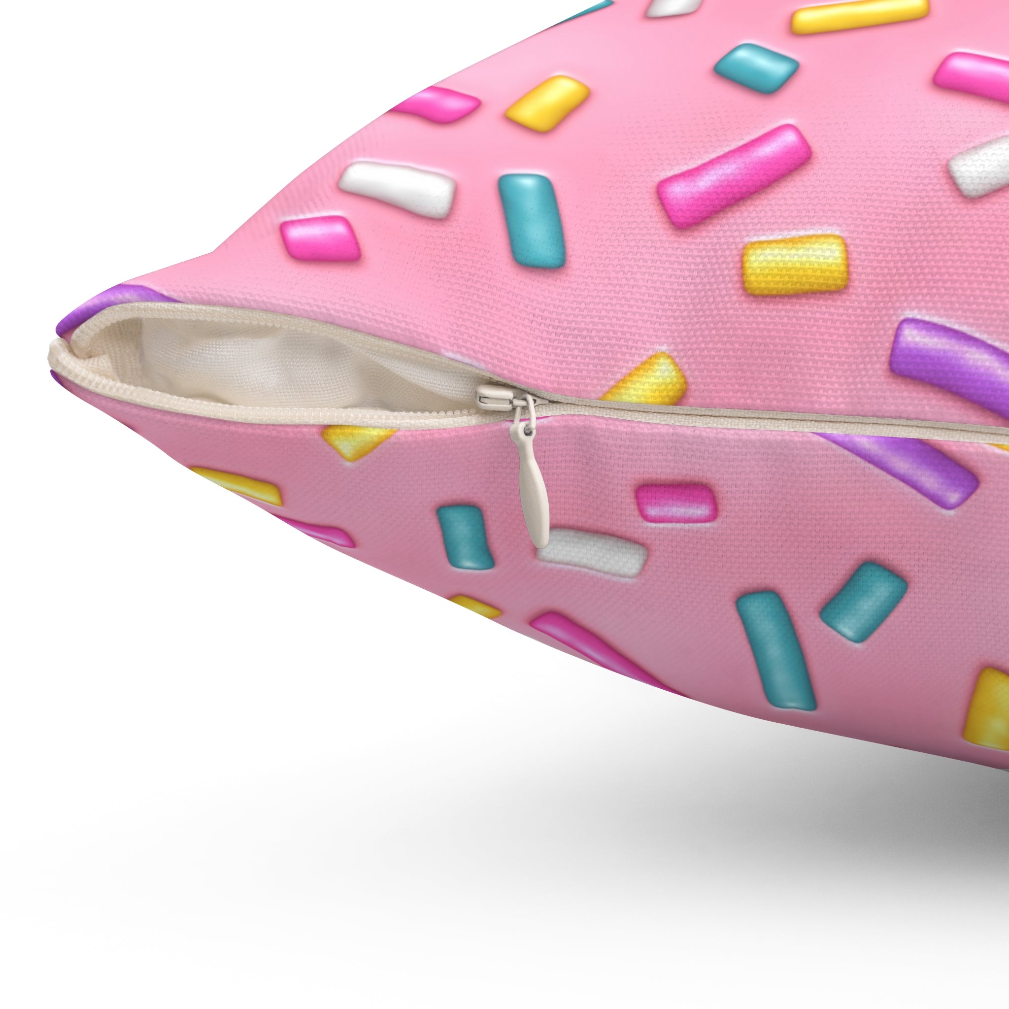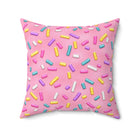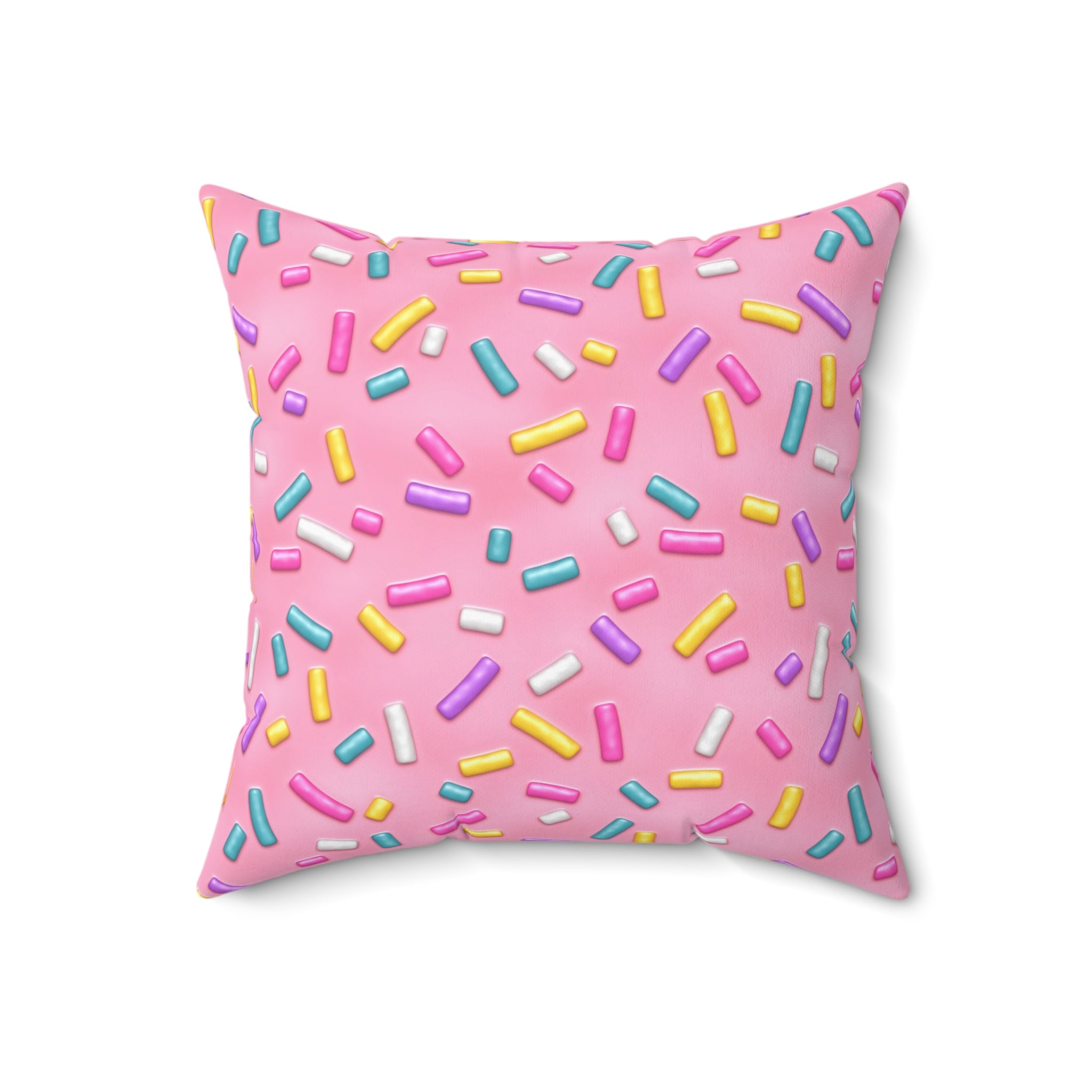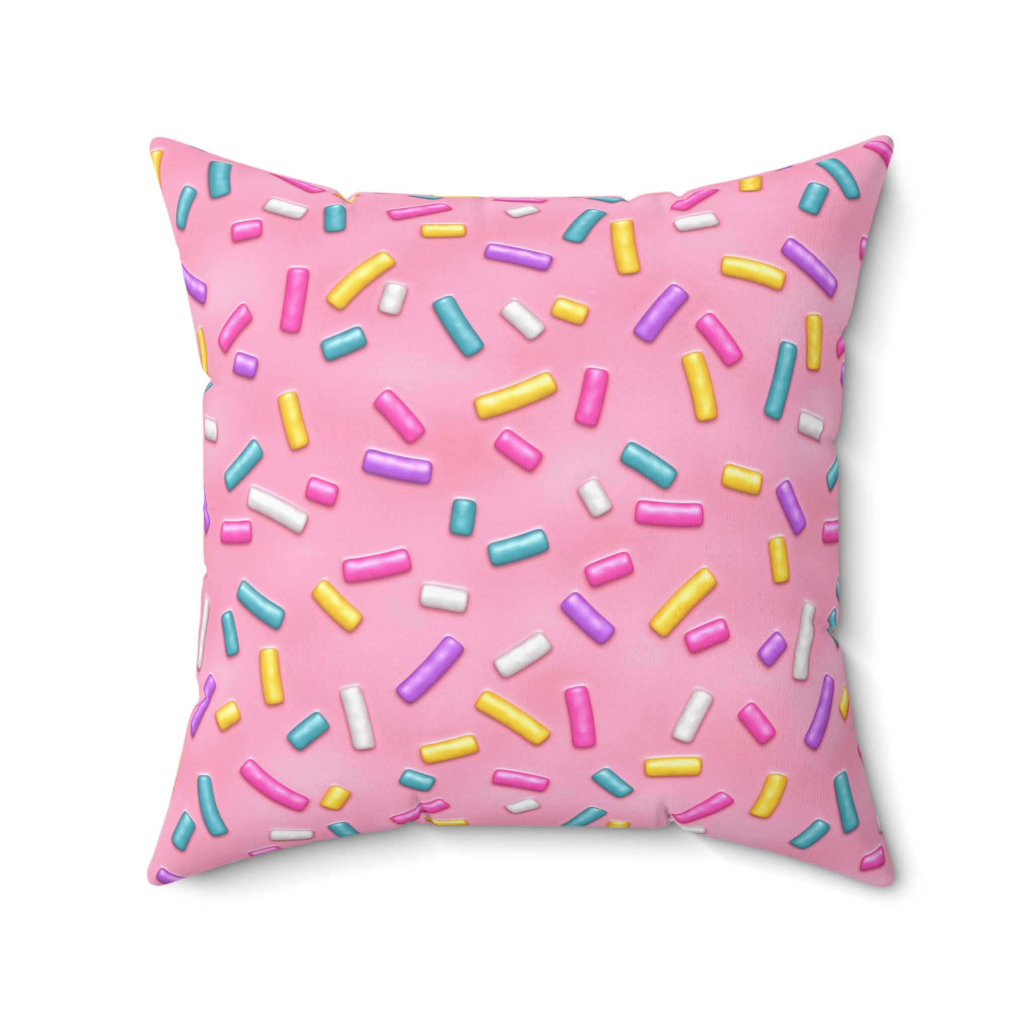 A cozy square pillow with a pink frosting and rainbow sprinkles design, giving a playful and fun vibe to any room. Perfect for those who love whimsical and colorful decor, this pillow is ideal for adding a touch of joy to a living room or bedroom. Great for birthdays, celebrations, or just adding a pop of color to your space.