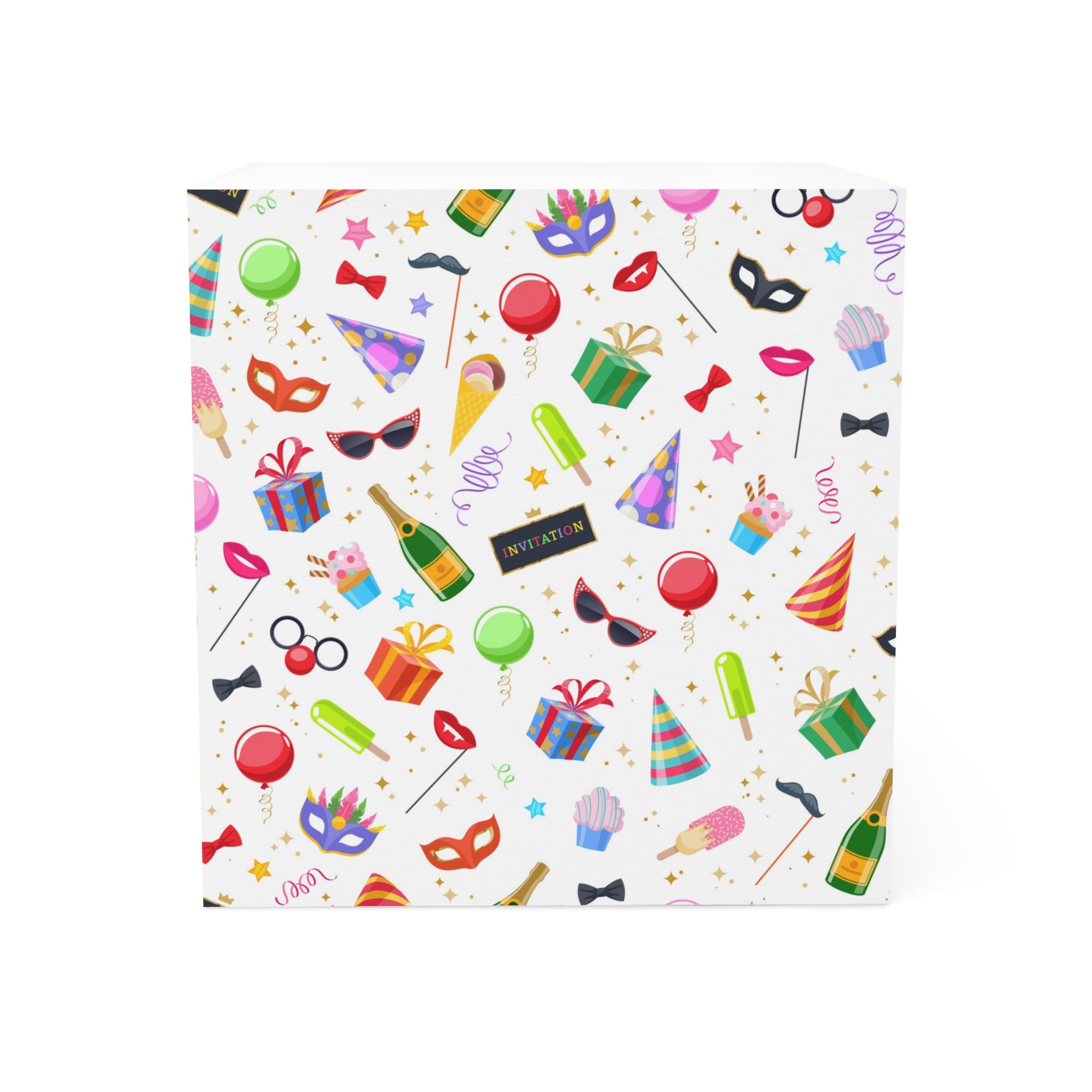 A vibrant and festive note cube featuring a champagne masquerade mask, party hat, balloons, and presents design, perfect for adding a touch of celebration to your daily notes. Ideal for those who love parties, celebrations, and special occasions like birthdays, New Year's Eve, and anniversaries.