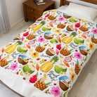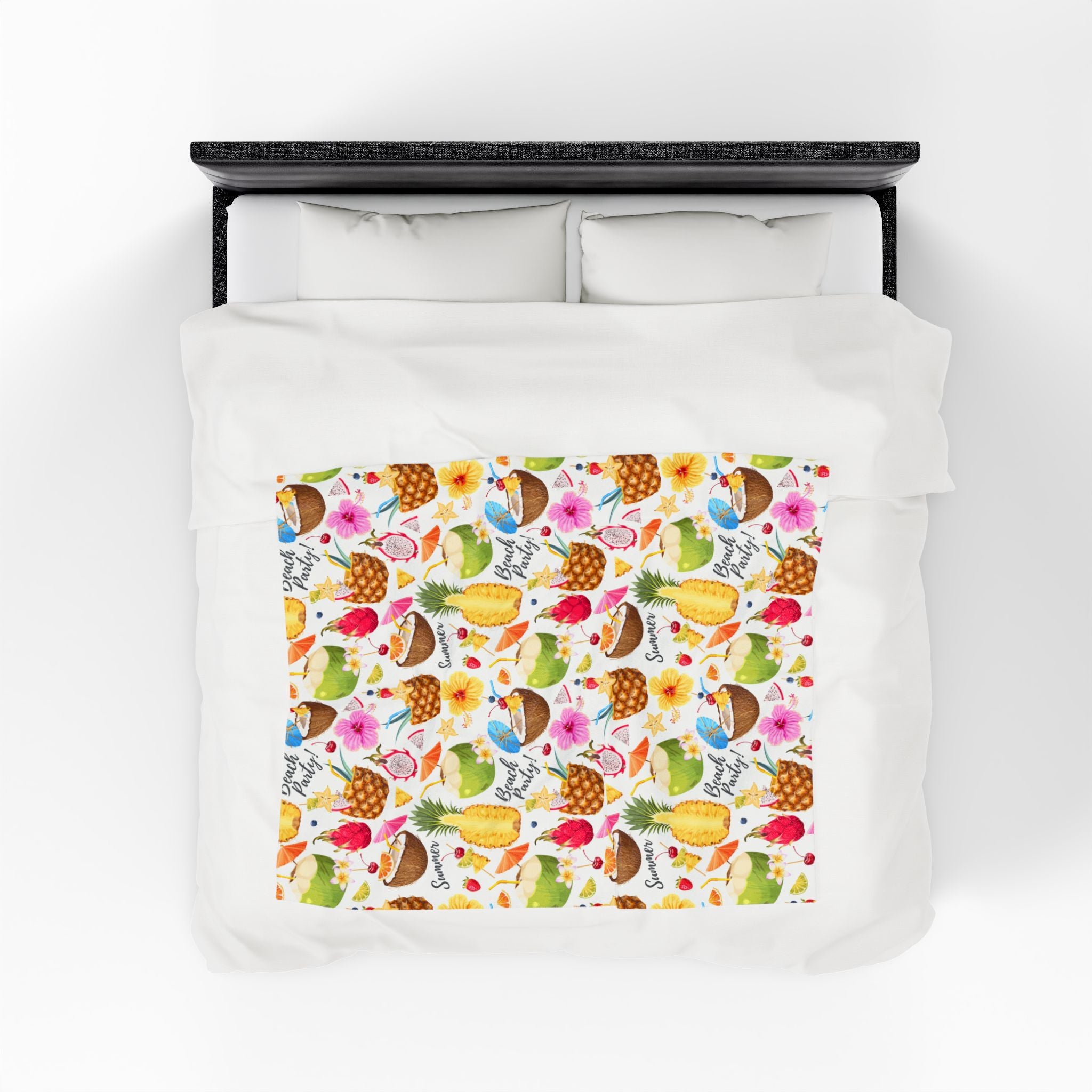 This velveteen plush blanket embodies the summer vibes with its design featuring summer cocktails, beach parties, coconut drinks, pineapple drinks, beach flowers, and summer fruits. Perfect for adults looking to bring a touch of summer into their lives, this medium heavy-weight blanket feels extra soft to the touch, making it ideal for cozying up during summer or as a decorative piece for beach-themed celebrations and parties.