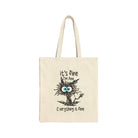 This Cotton Canvas Tote Bag features a cute frazzled black kitty with the saying 'It's Fine, I'm Fine, Everything is Fine'. Perfect for cat lovers who appreciate a touch of humor in their everyday accessories. Ideal for carrying books, groceries, or personal items, adding a fun and relatable touch to your daily outings. Great for gifting on birthdays, holidays, or as a treat for yourself.