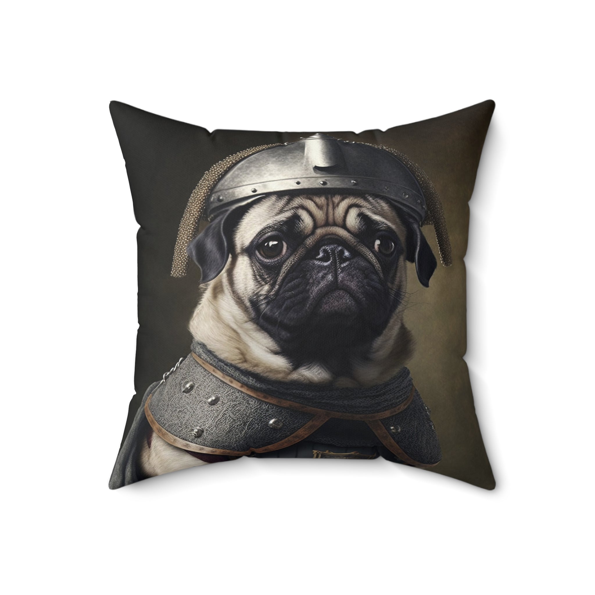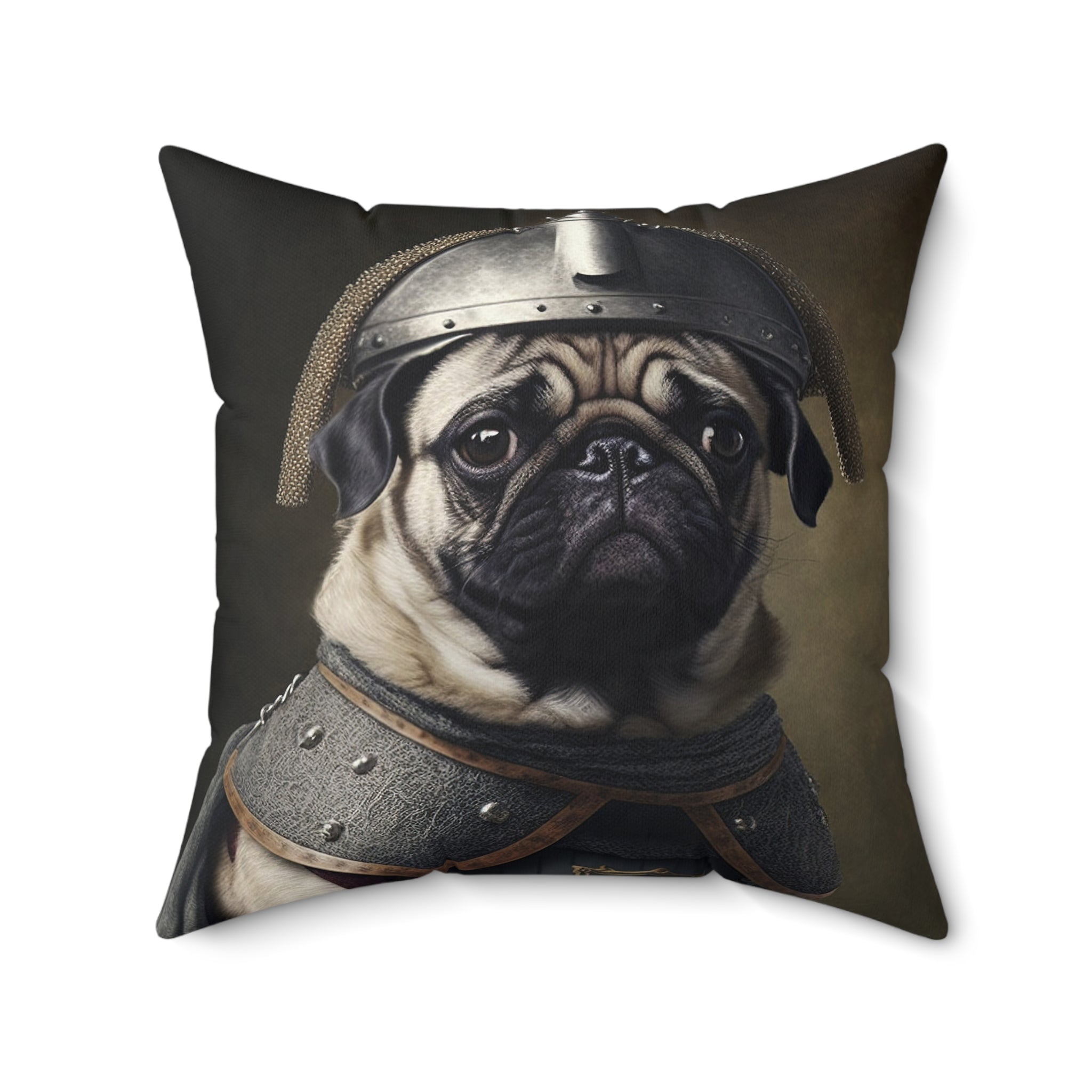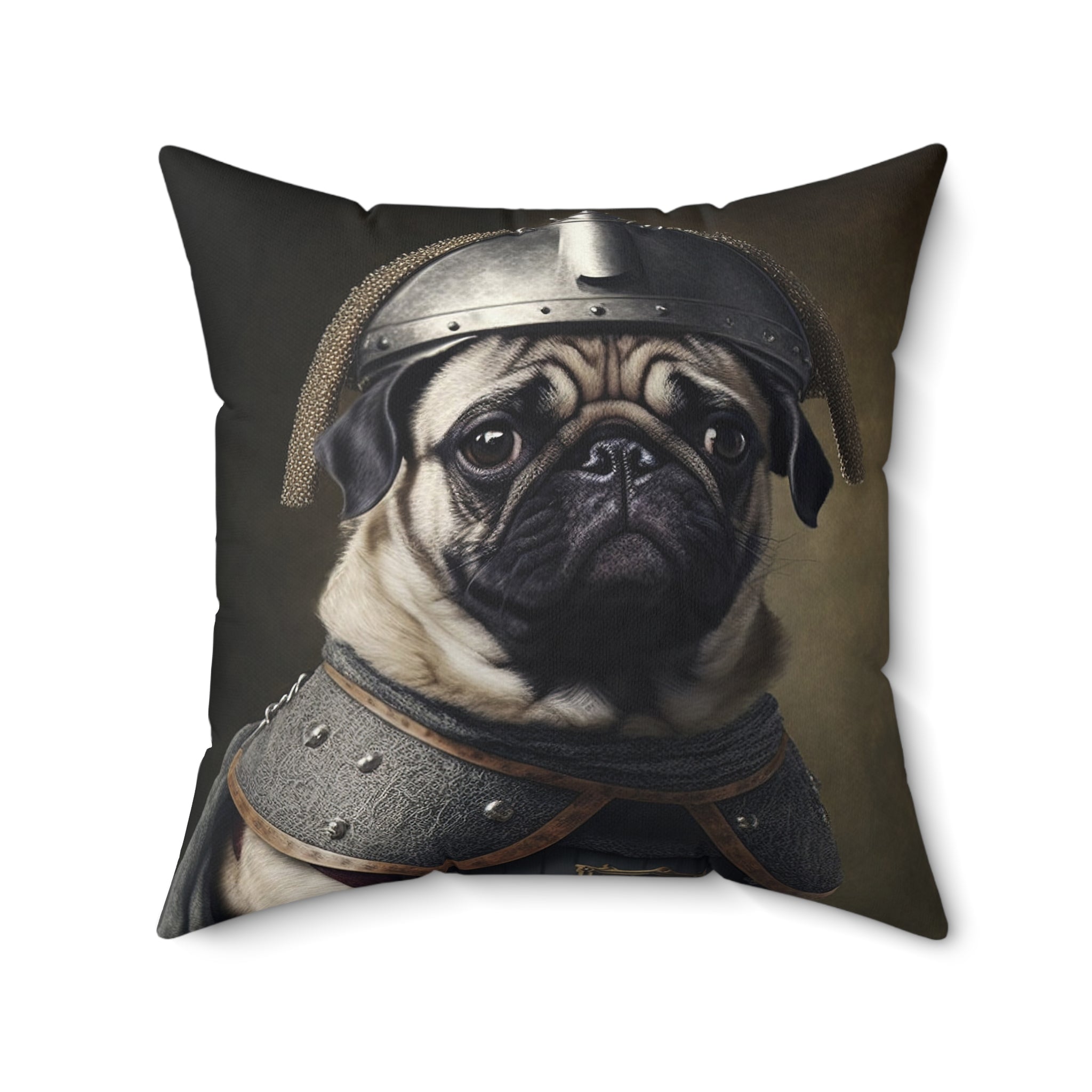 Add a touch of whimsy to your home with this adorable Pug Square Pillow featuring a pug wearing a medieval outfit with a knight helmet. Perfect for animal lovers and those who enjoy cute and unique decor. Great for adding a festive touch during Halloween or medieval-themed parties.