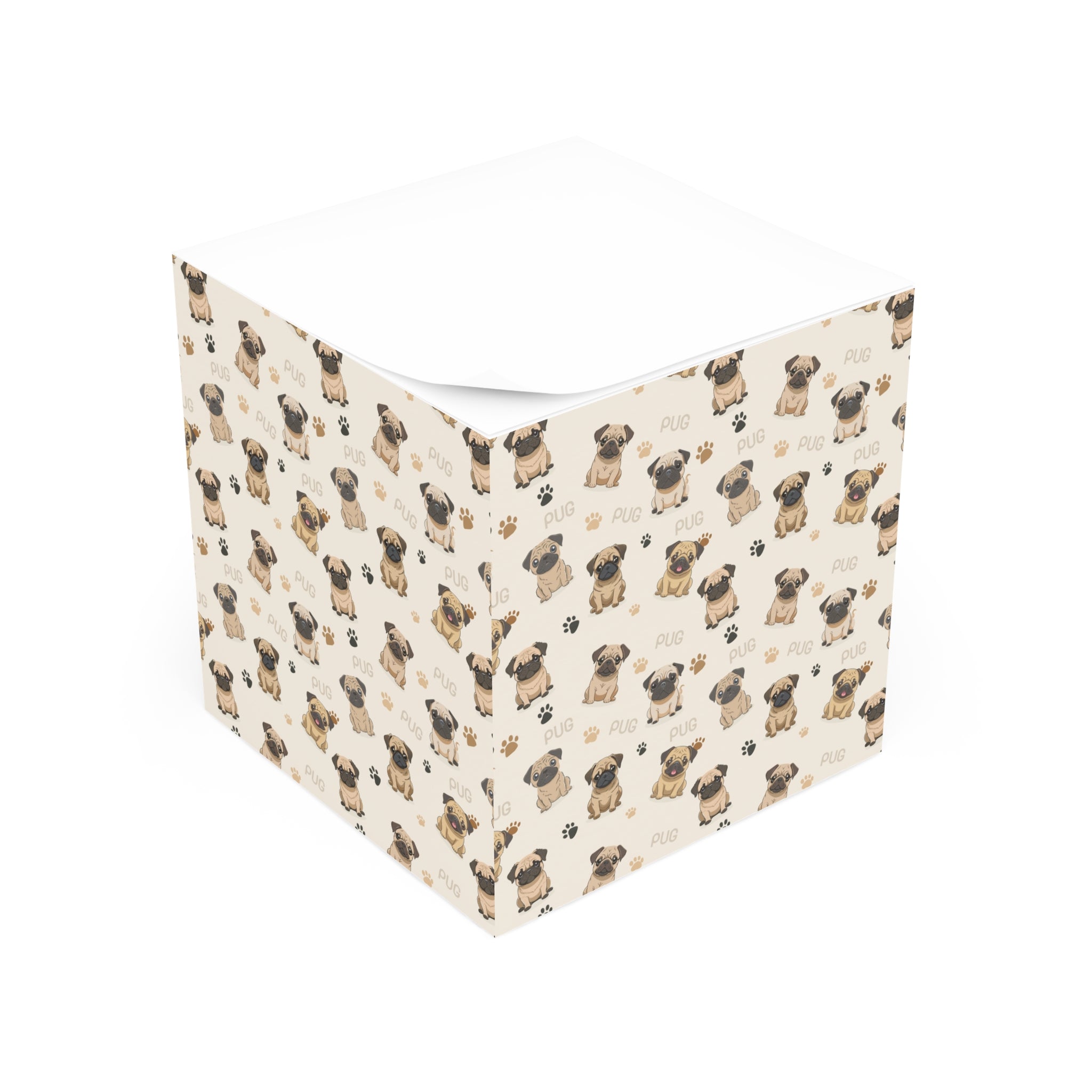 A cute and playful note cube featuring pug paw prints and the word 'pug'. Perfect for pug lovers and dog enthusiasts. Ideal for keeping your notes organized in a fun and whimsical way. Great for gifting during birthdays, Christmas, or just because.