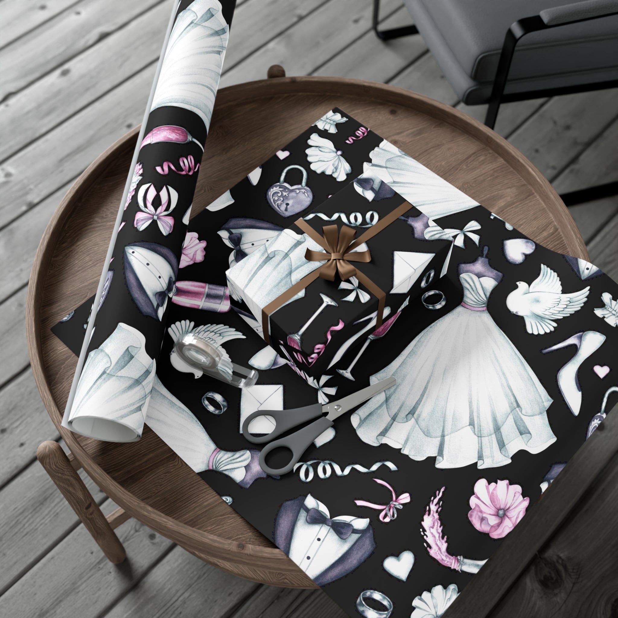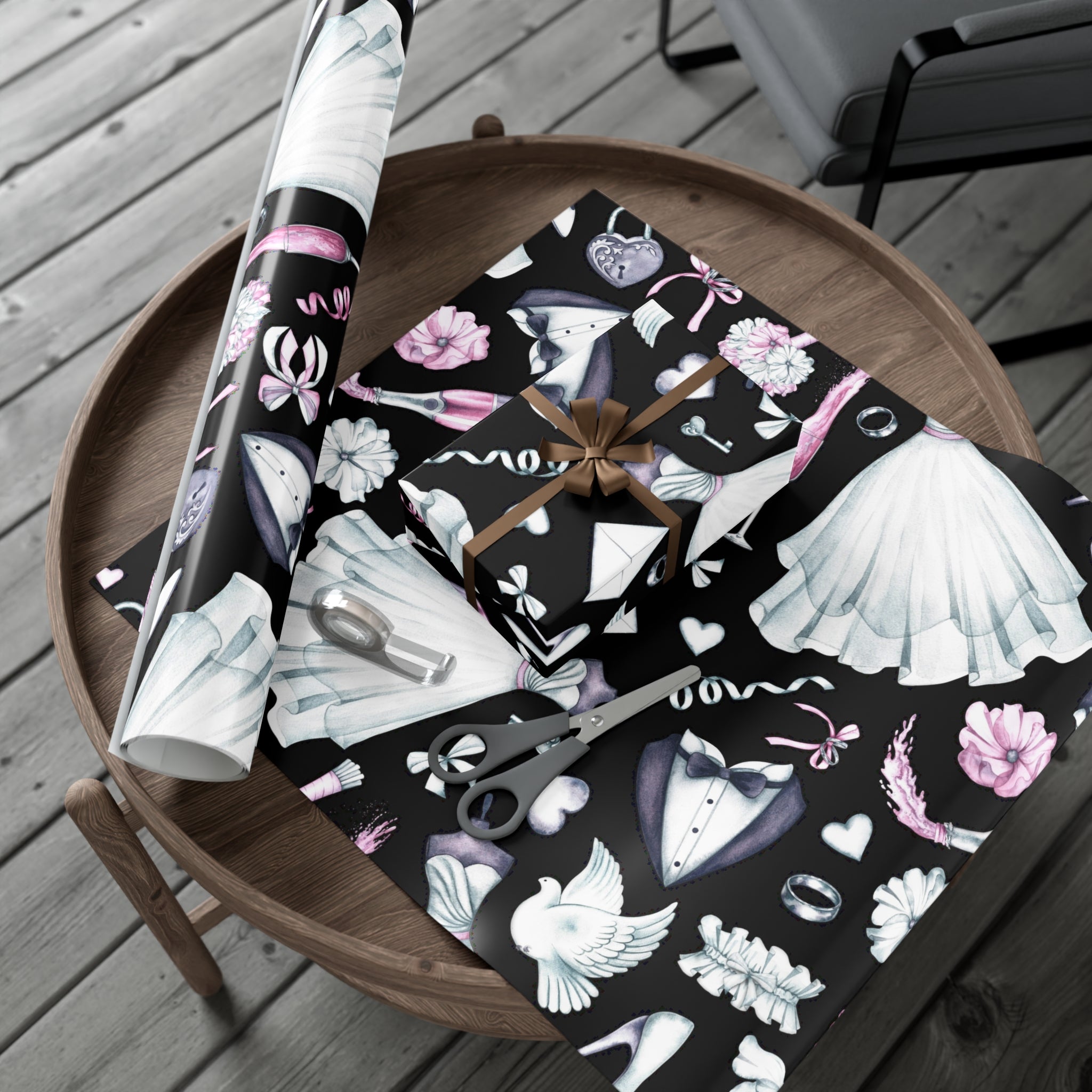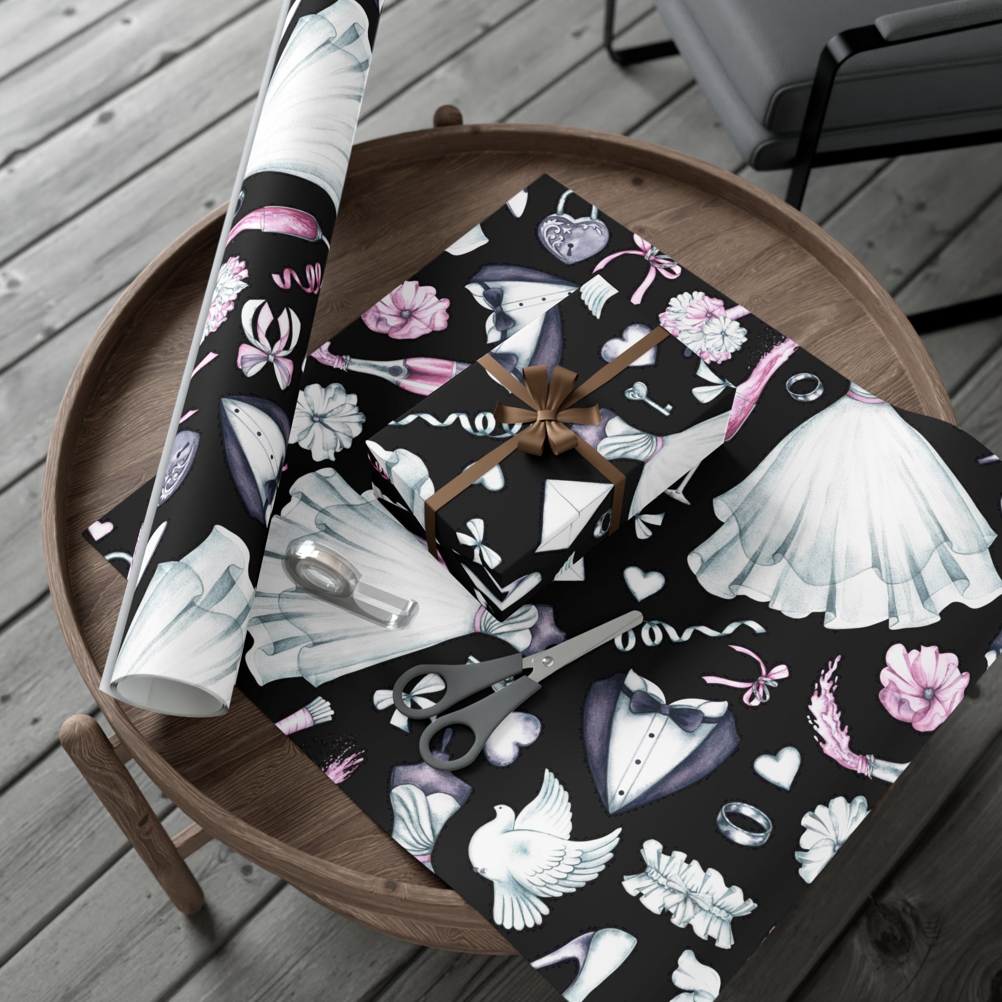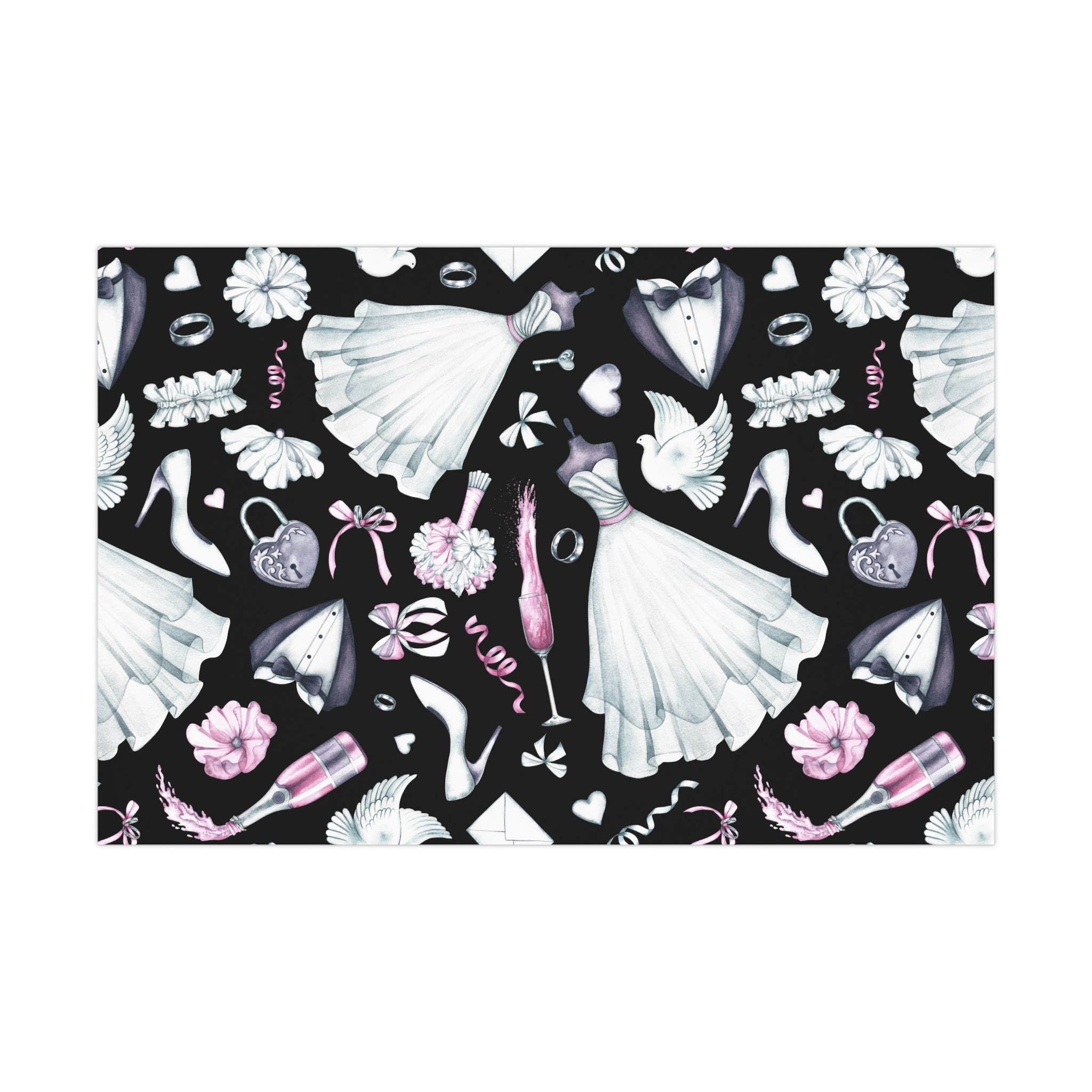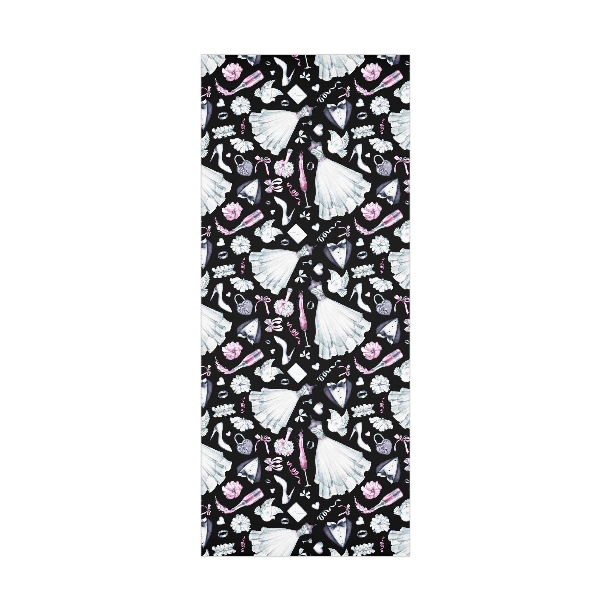 Celebrate love and weddings with this beautiful wedding-themed wrapping paper. Featuring elegant illustrations of wedding dress, grooms' tux, wedding shoes, champagne, garter, and wedding rings, this wrapping paper is perfect for wrapping wedding gifts and presents. Ideal for couples getting married, wedding guests, bridal showers, and anniversaries.