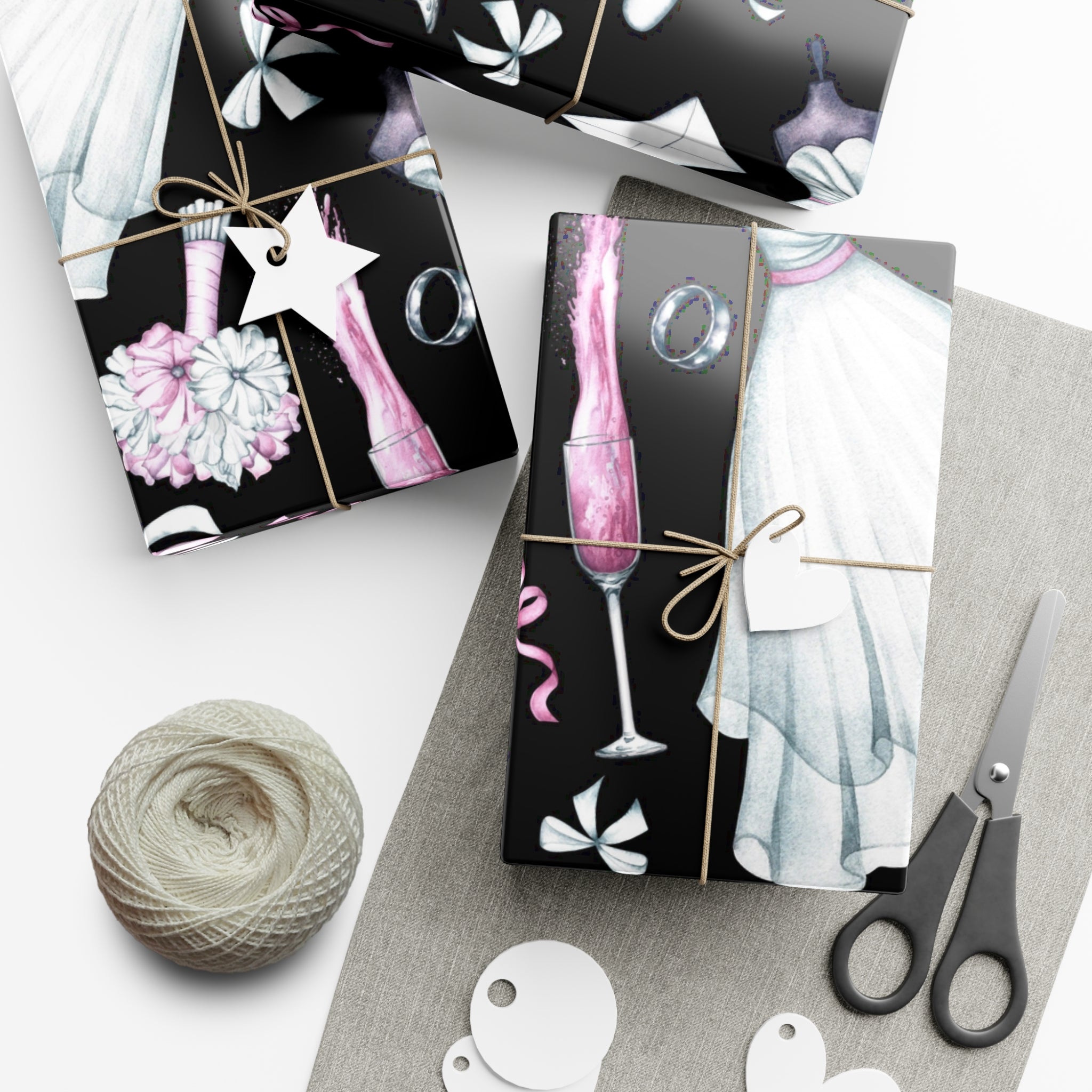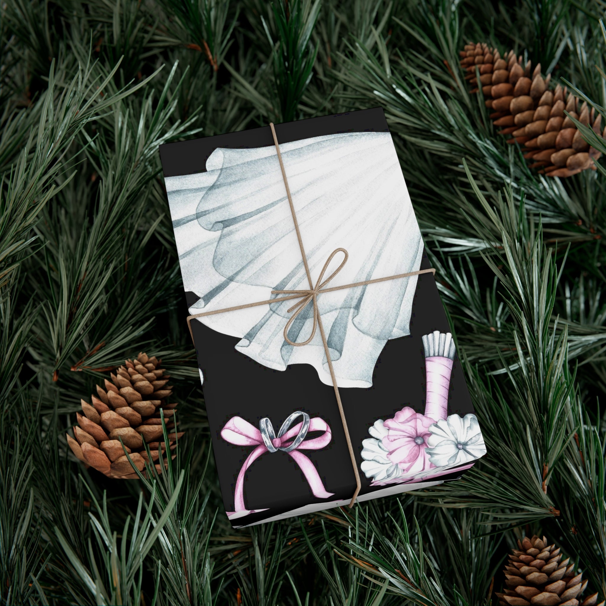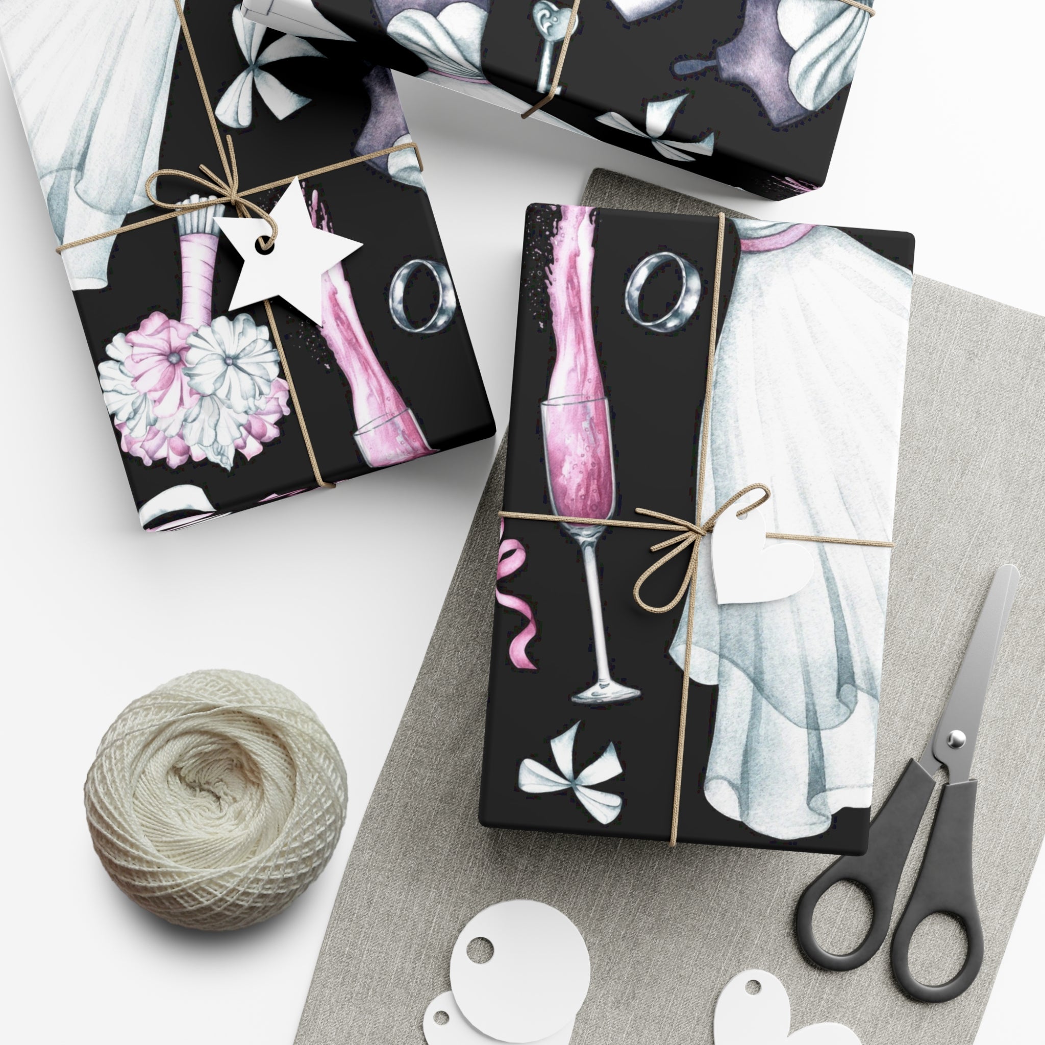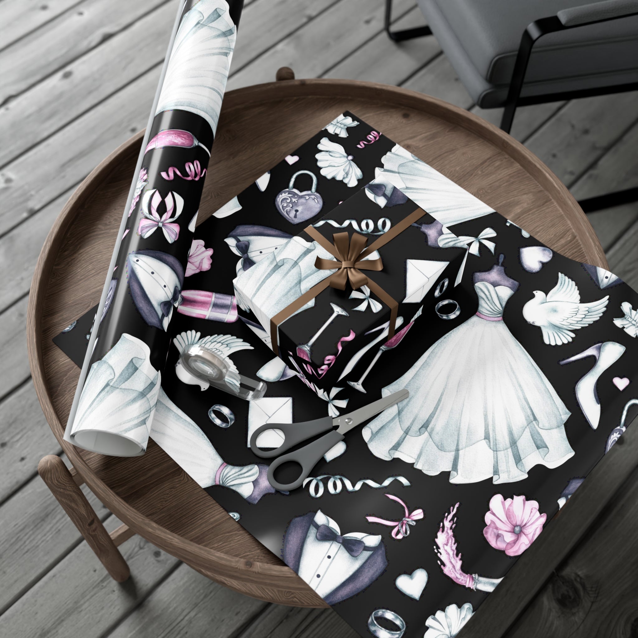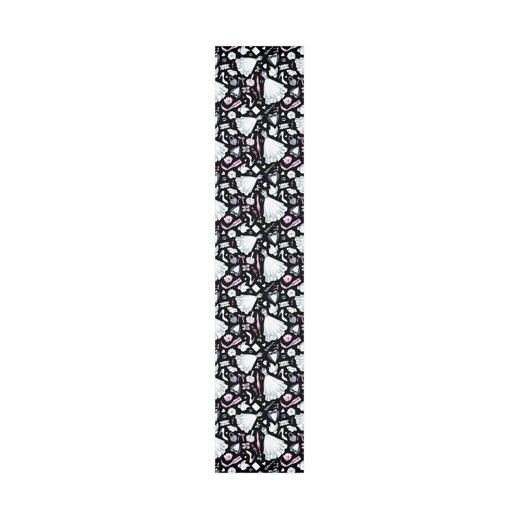 Celebrate love and weddings with this beautiful wedding-themed wrapping paper. Featuring elegant illustrations of wedding dress, grooms' tux, wedding shoes, champagne, garter, and wedding rings, this wrapping paper is perfect for wrapping wedding gifts and presents. Ideal for couples getting married, wedding guests, bridal showers, and anniversaries.