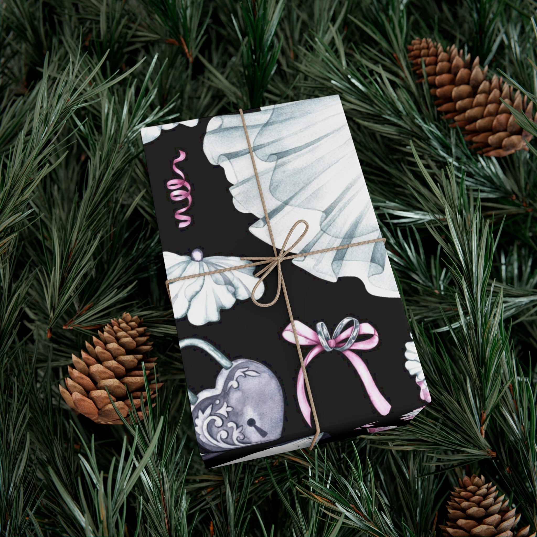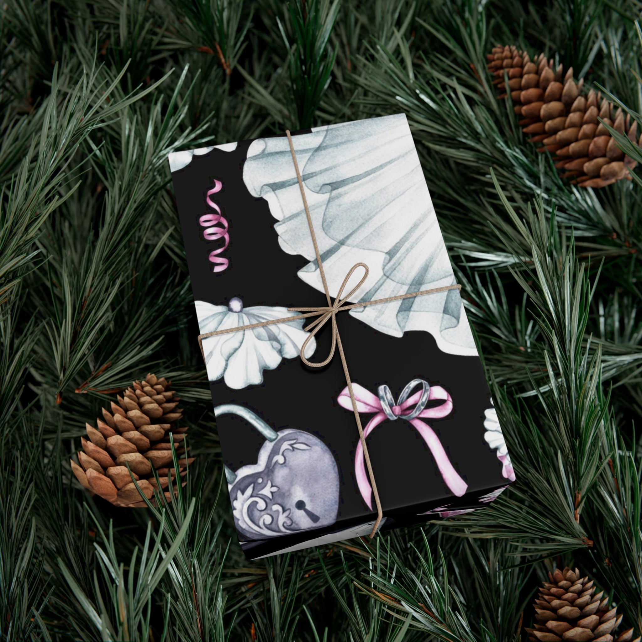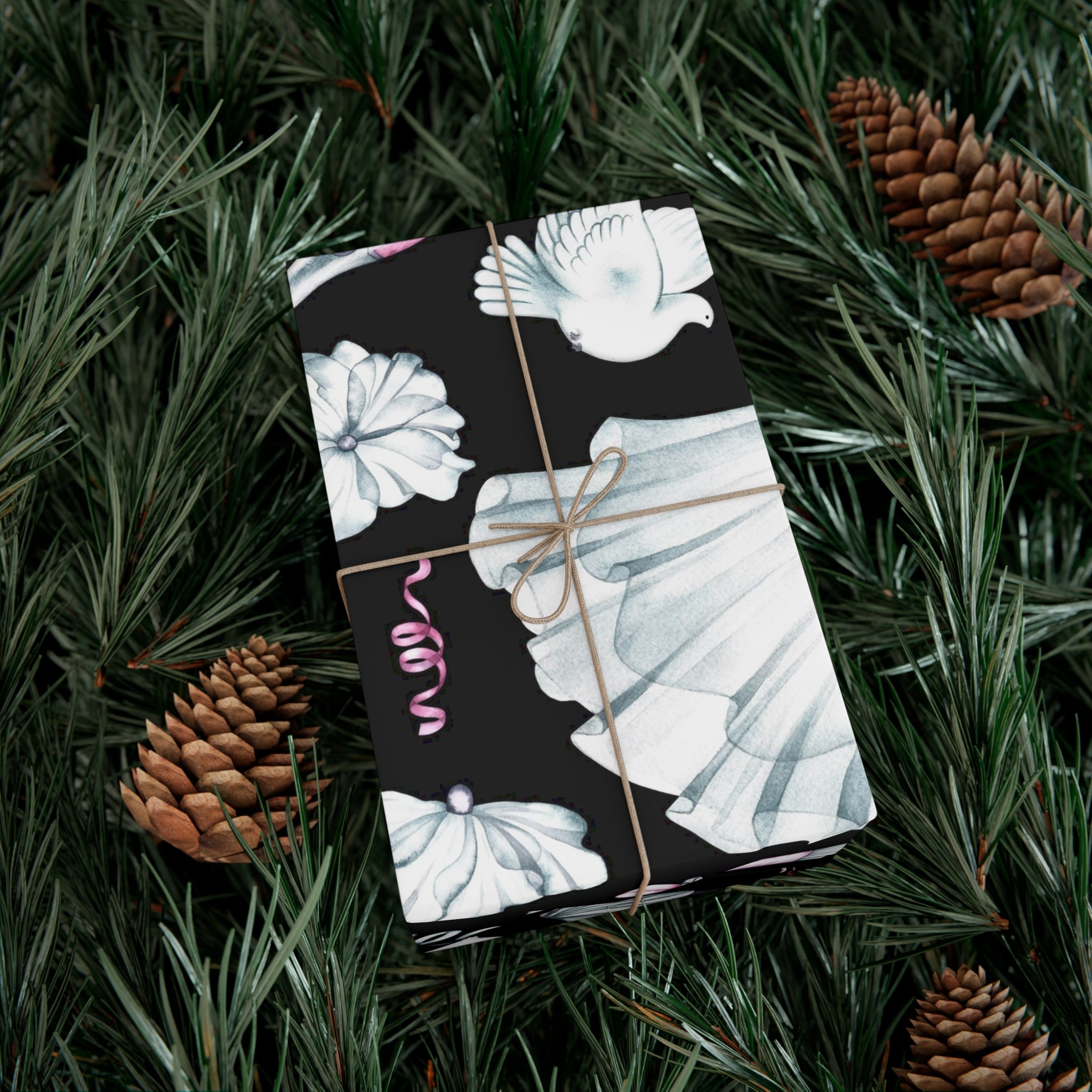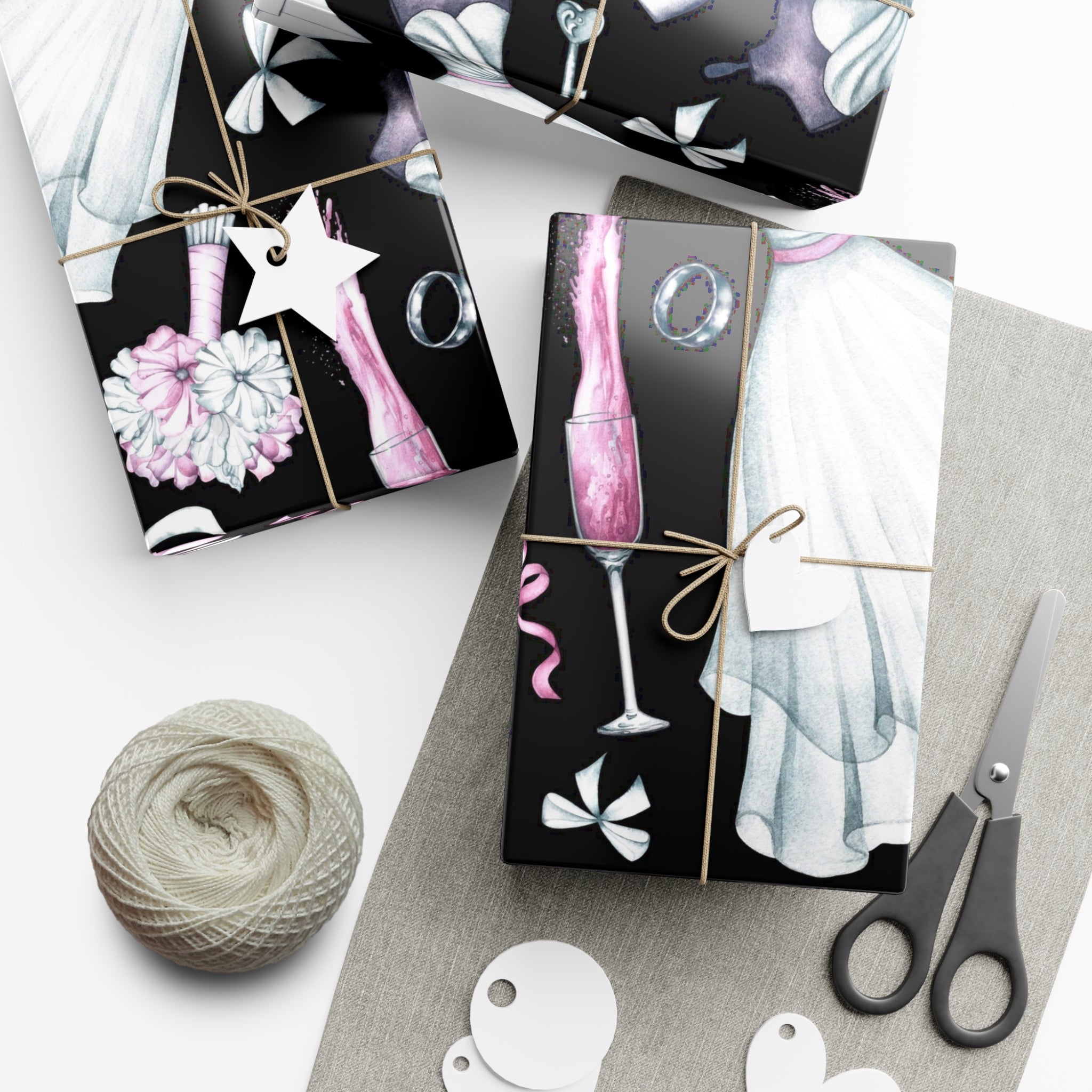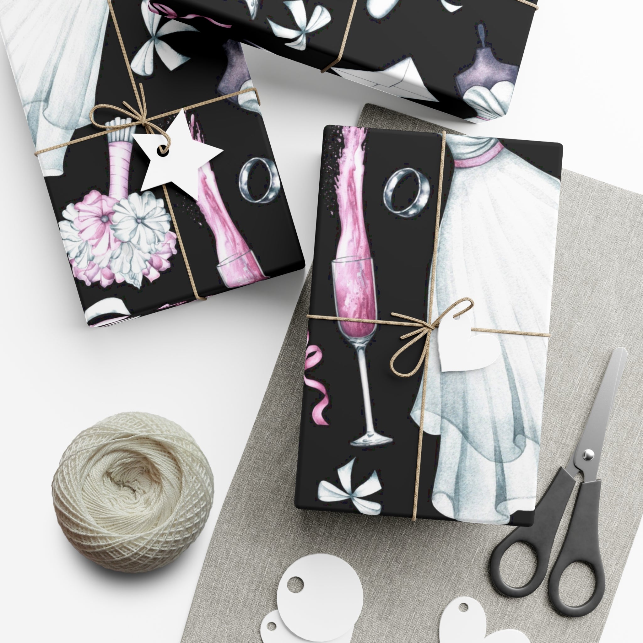 Celebrate love and weddings with this beautiful wedding-themed wrapping paper. Featuring elegant illustrations of wedding dress, grooms' tux, wedding shoes, champagne, garter, and wedding rings, this wrapping paper is perfect for wrapping wedding gifts and presents. Ideal for couples getting married, wedding guests, bridal showers, and anniversaries.