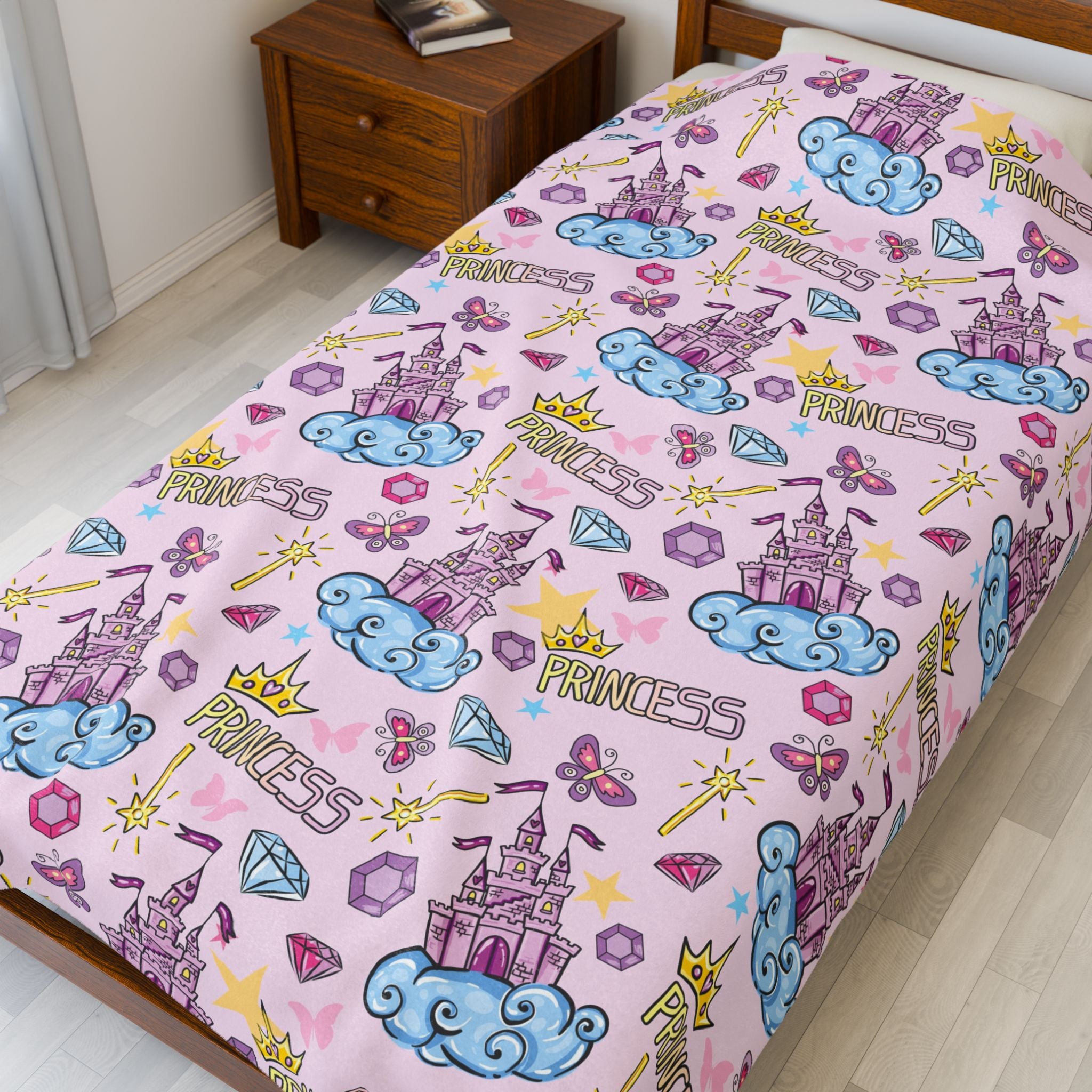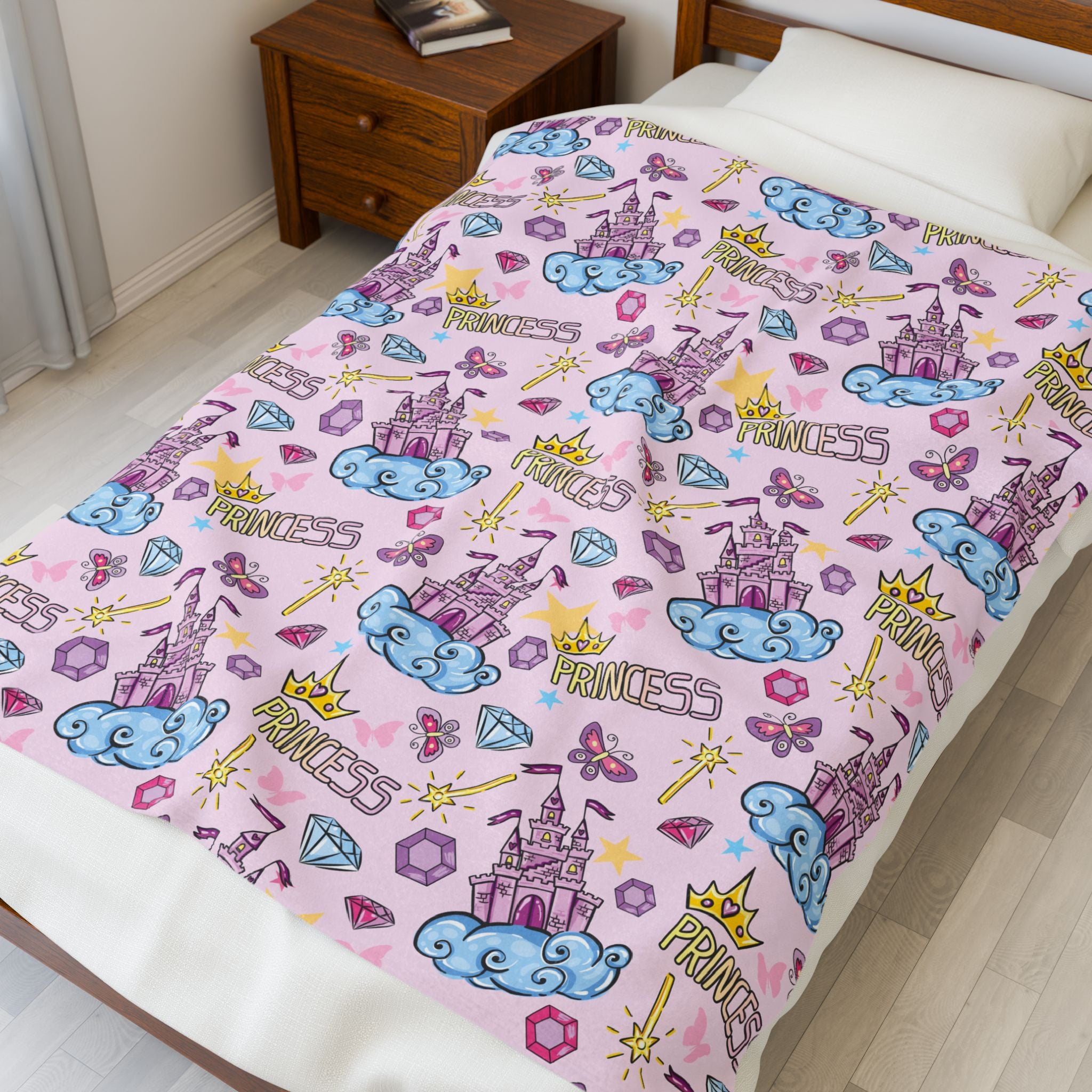 This velveteen plush blanket features a princess castle, crown, butterfly, diamond, and stars on a pink background, giving a royal and magical vibe. Perfect for anyone who wants to add a touch of whimsy and luxury to their home decor. Ideal for gifting on birthdays, holidays, or as a special treat for yourself.